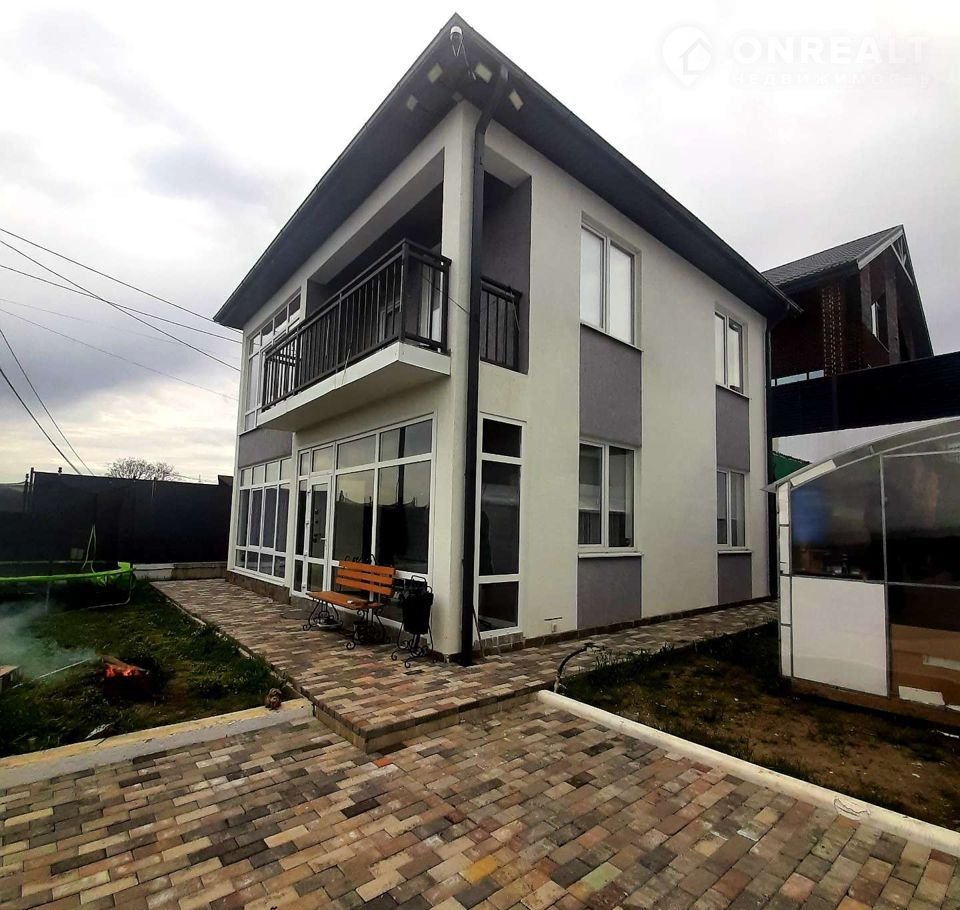 В доме 2 этажа,  высота потолков 3м,  просторный балкон с ограждением, панорамное остекление, системы кондиционирования. Выполнено благоустройство и озеленение придомовой территории, 2 м/места на  территории, летняя кухня с камином, тех.помещение.