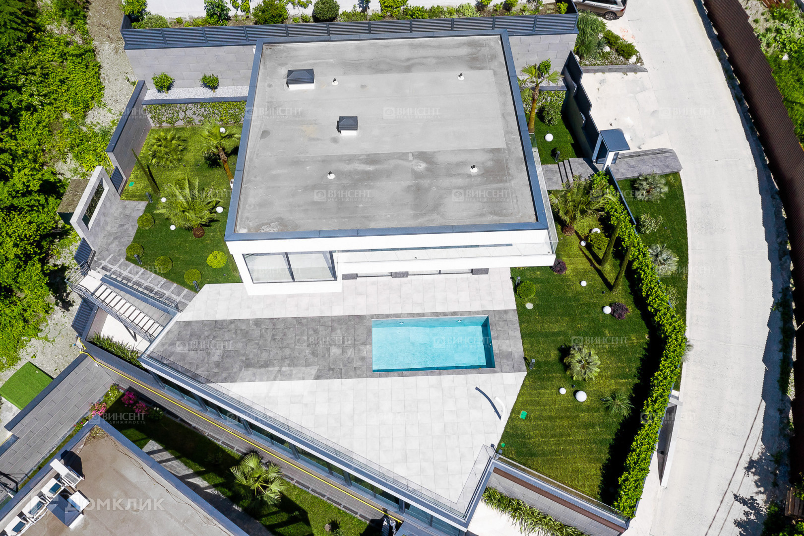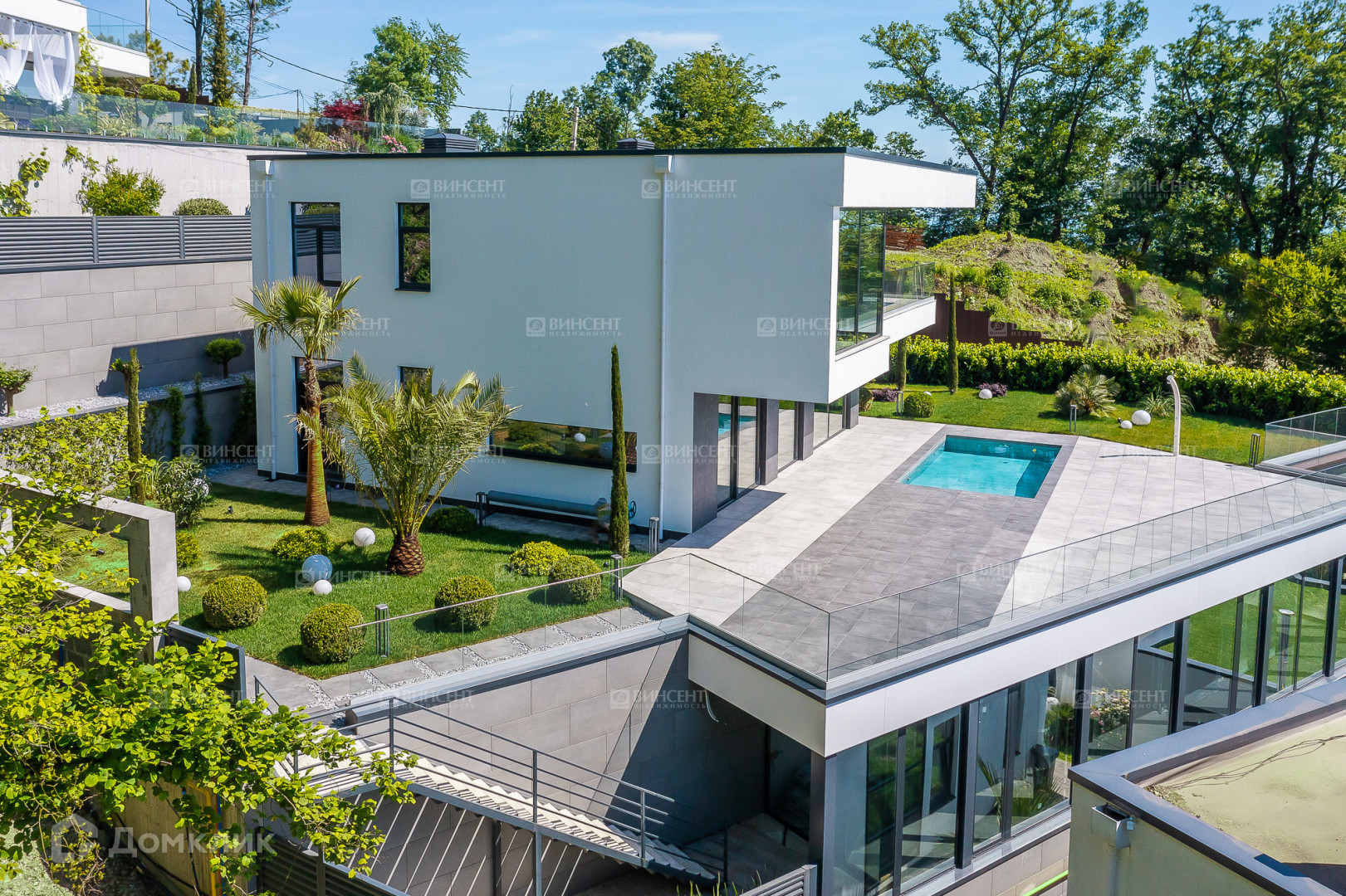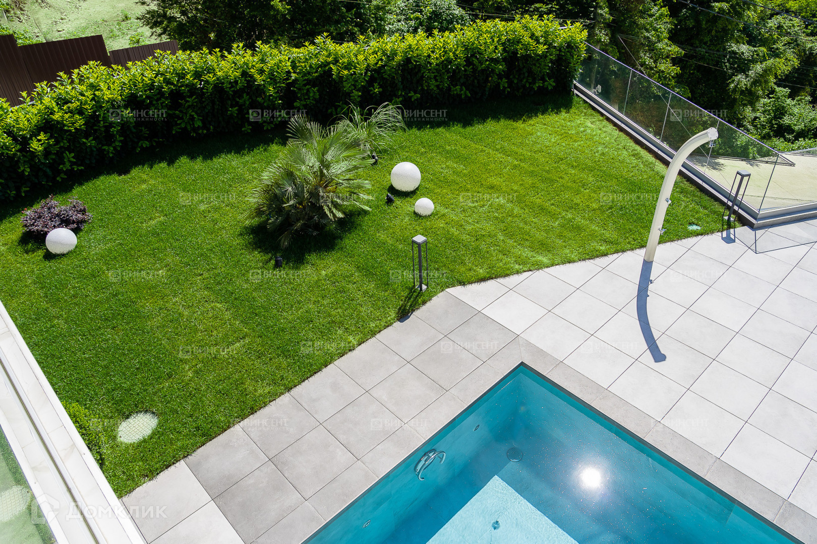 - Террасу площадью 160 кв.м. перед главным фасадом дома вокруг бассейна, ограждённую с видовой стороны закаленным стеклом, на которой с легкостью разместятся шезлонги с зонтами, обеденная группа под консолью второго этажа дома и диванная зона под открытым небом;