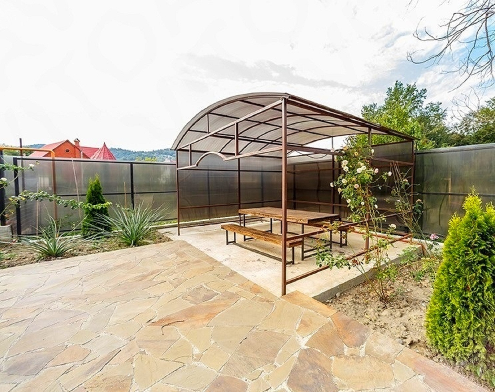 Территория участка так же облагорожена, высажены декоративные деревья,выложена плитка и сделана крытая беседка и зона барбекю.