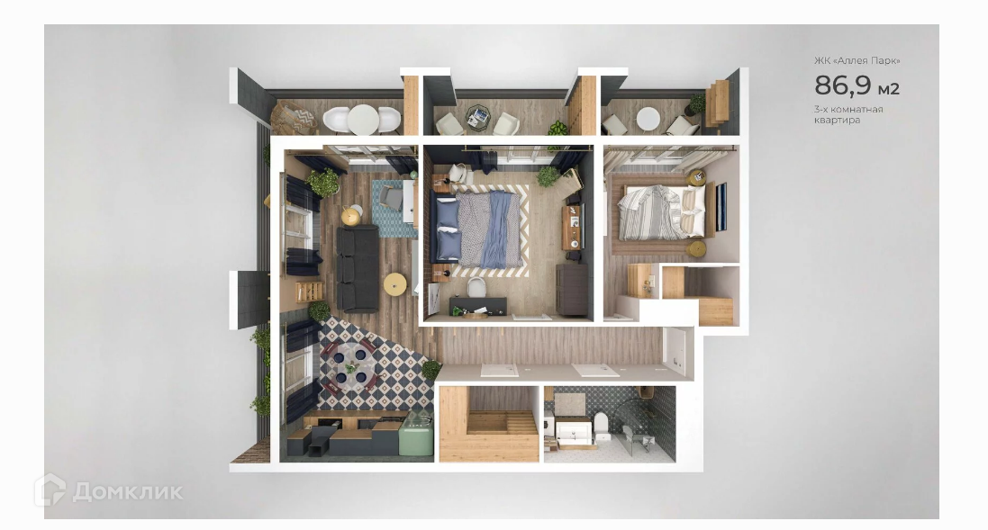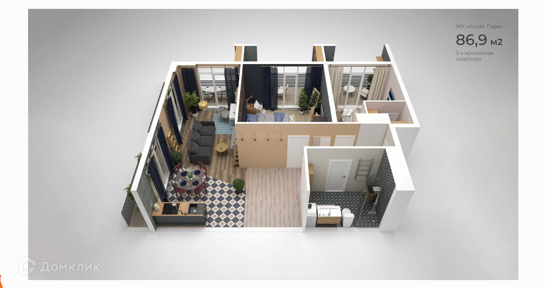 На площади 86.9 м2 распланированы 2 спальных комнаты, большая кухня гостиная, большая гардеробная, санузел и 3 балкона вход из каждой комнаты.