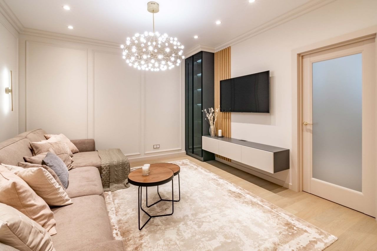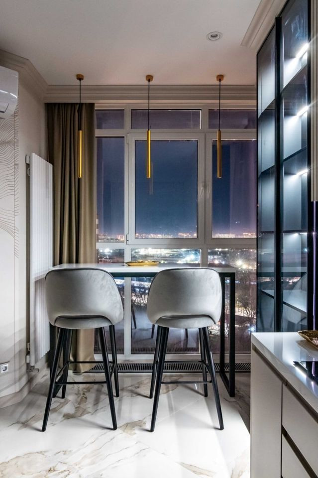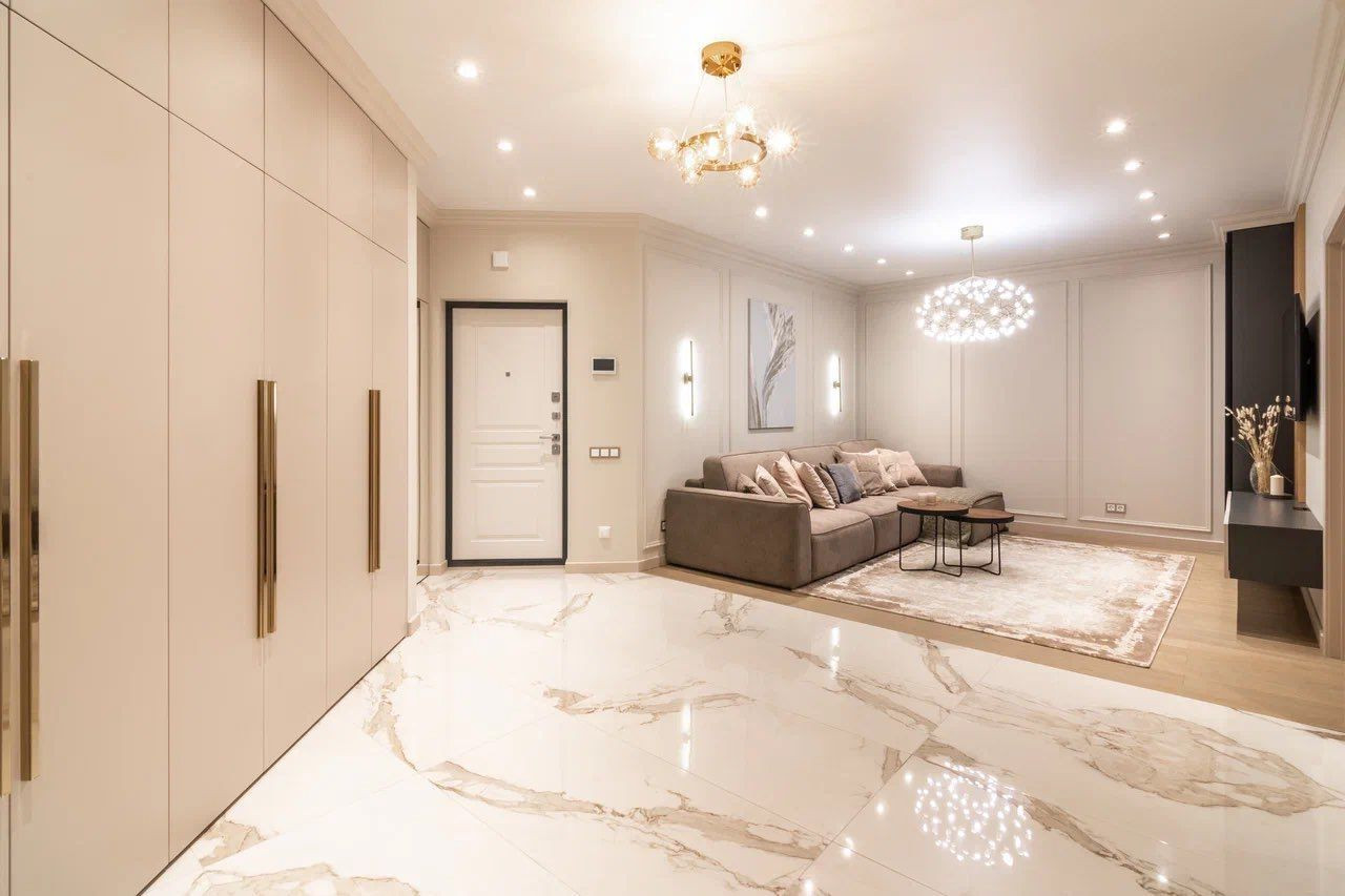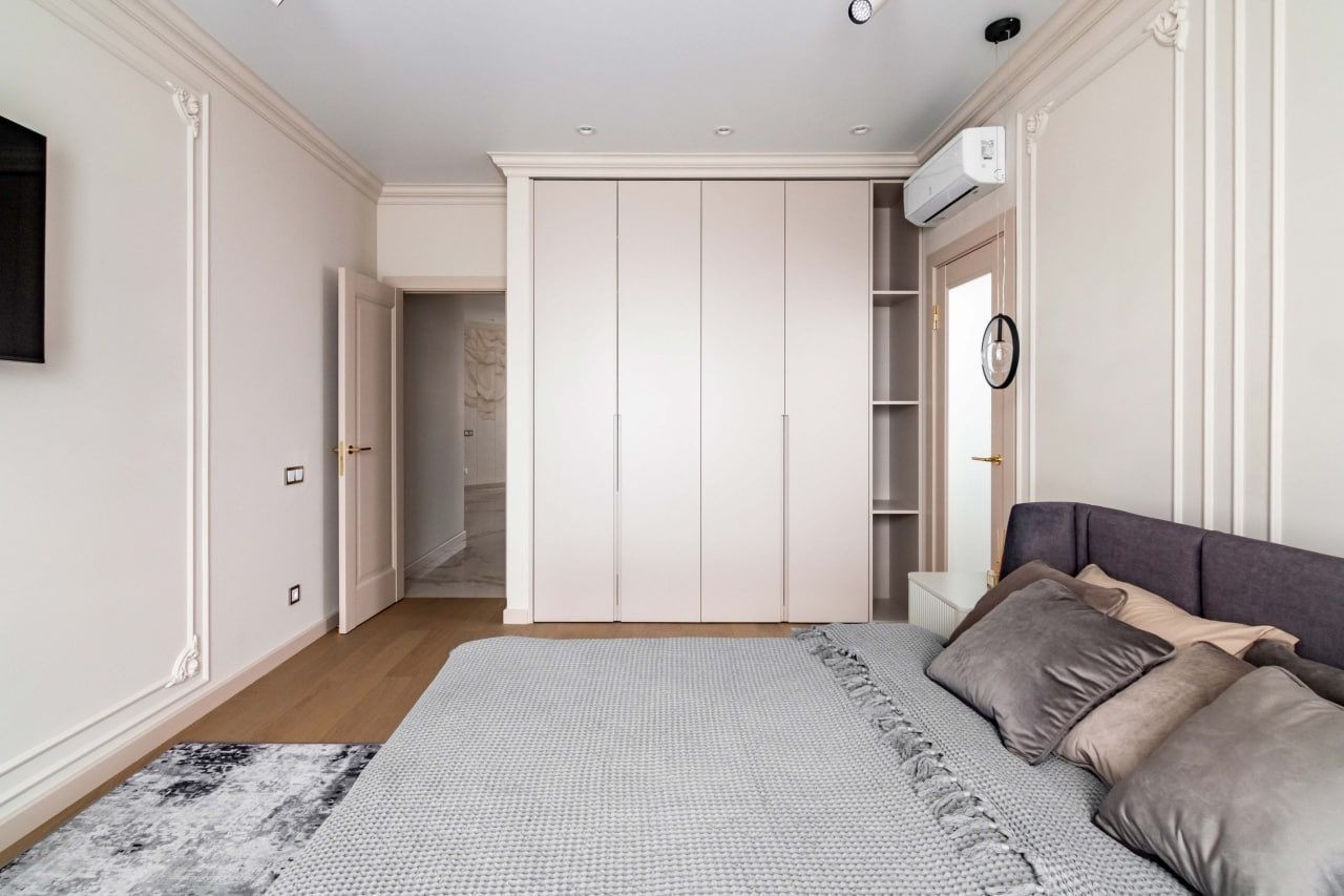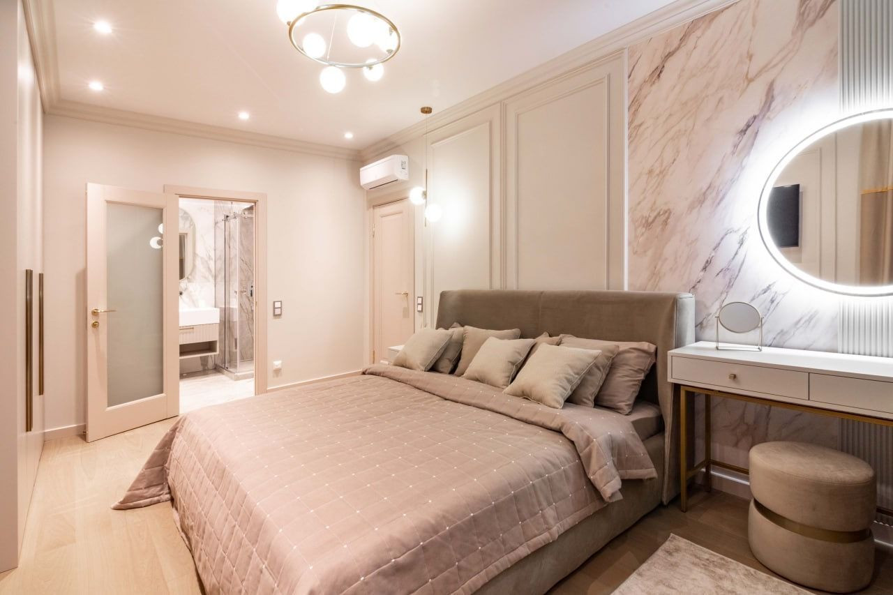 Квартира характеризуется качественными ремонтными работами с использованием дорогих материалов. В просторных помещениях вы встретите современный, выдержанный в классических традициях дизайн. Контрастные тона расцветок фасадов, обивки мебели свидетельствуют о желании создателей интерьера подчеркнуть его изысканность. Огромное зеркало в обеденной зоне, прозрачный стол и стулья создают комфортные условия. В квартире установлена мебель от известных брендов.