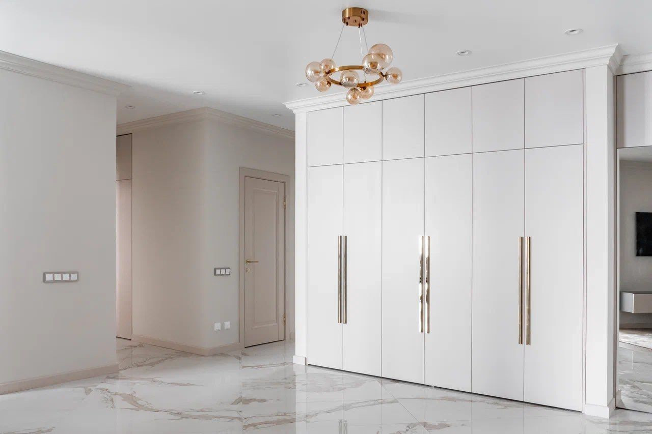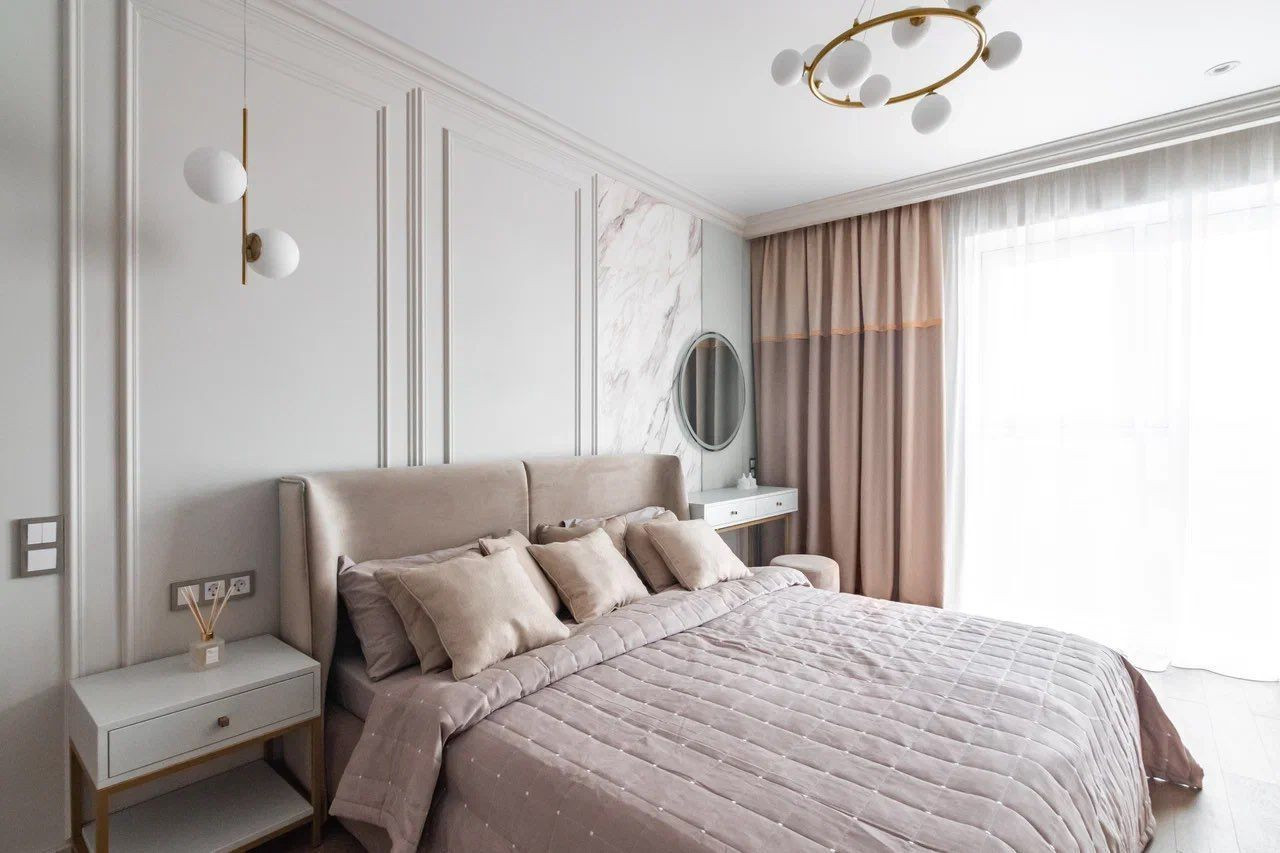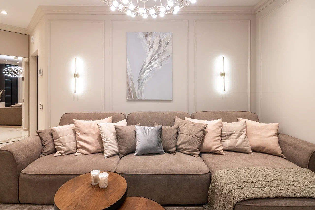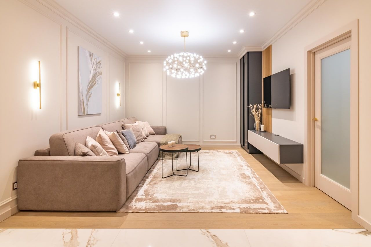 Квартира характеризуется качественными ремонтными работами с использованием дорогих материалов. В просторных помещениях вы встретите современный, выдержанный в классических традициях дизайн. Контрастные тона расцветок фасадов, обивки мебели свидетельствуют о желании создателей интерьера подчеркнуть его изысканность. Огромное зеркало в обеденной зоне, прозрачный стол и стулья создают комфортные условия. В квартире установлена мебель от известных брендов.