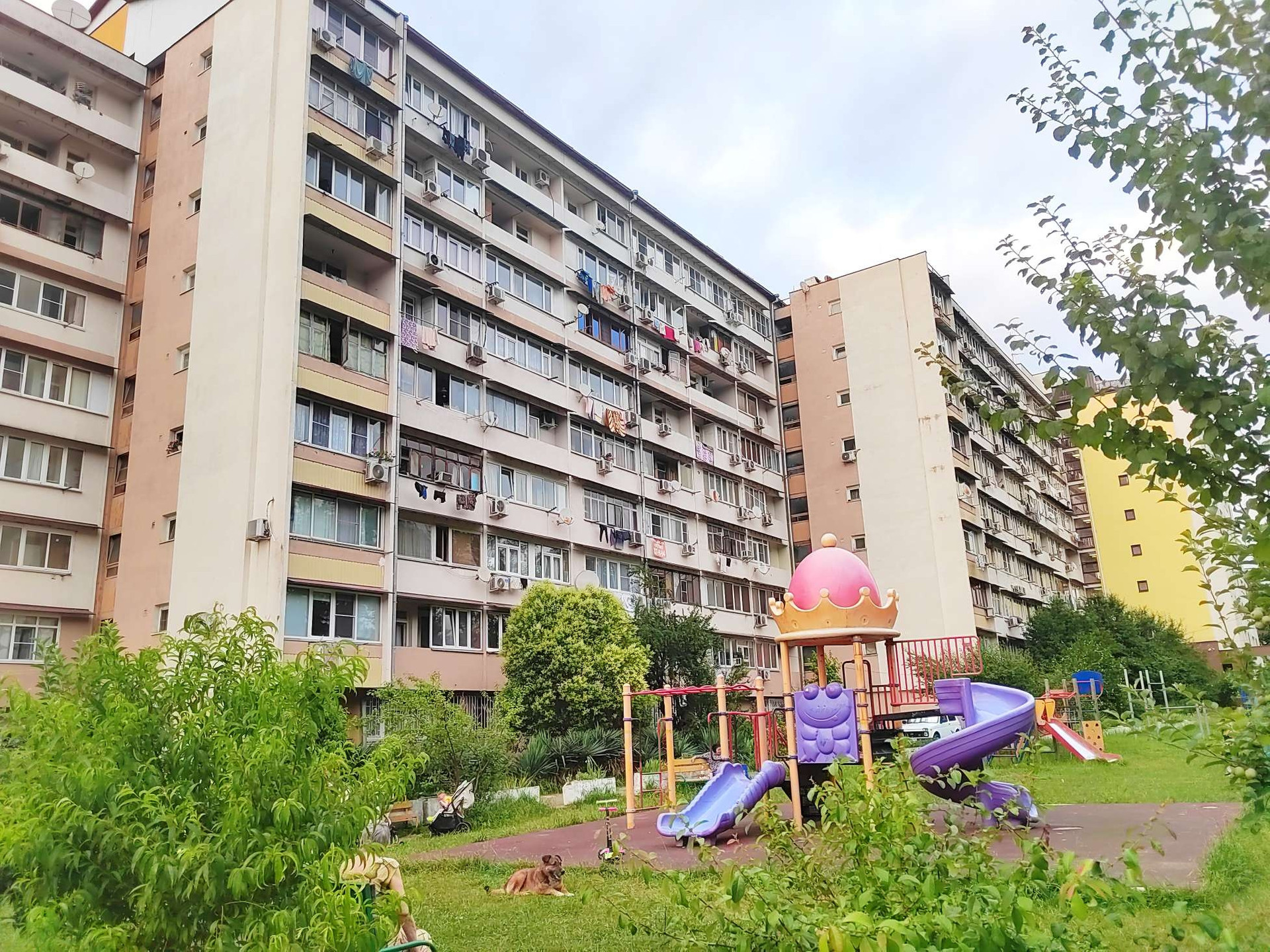 Возле дома детская и спортивная площадка, магазины, рынок, супермаркет Пятерочка, остановка.