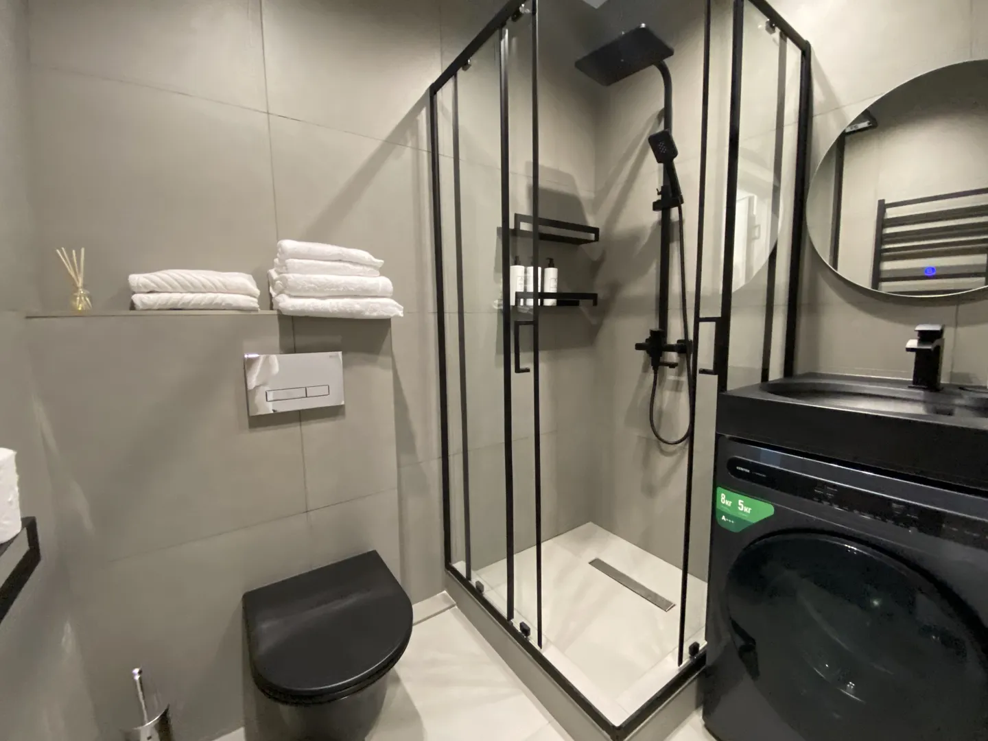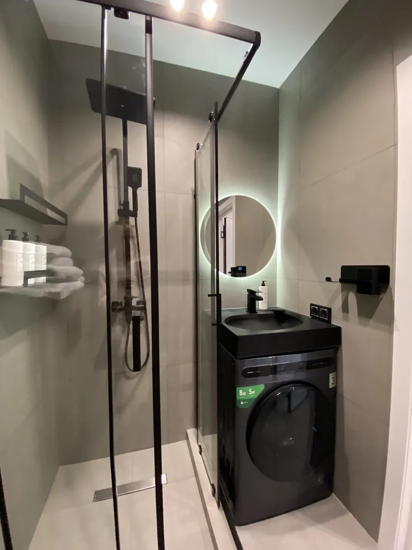 Кухонная зона с обеденным столом, санузел с душевой кабиной и стиральной машиной с встроенной сушкой.