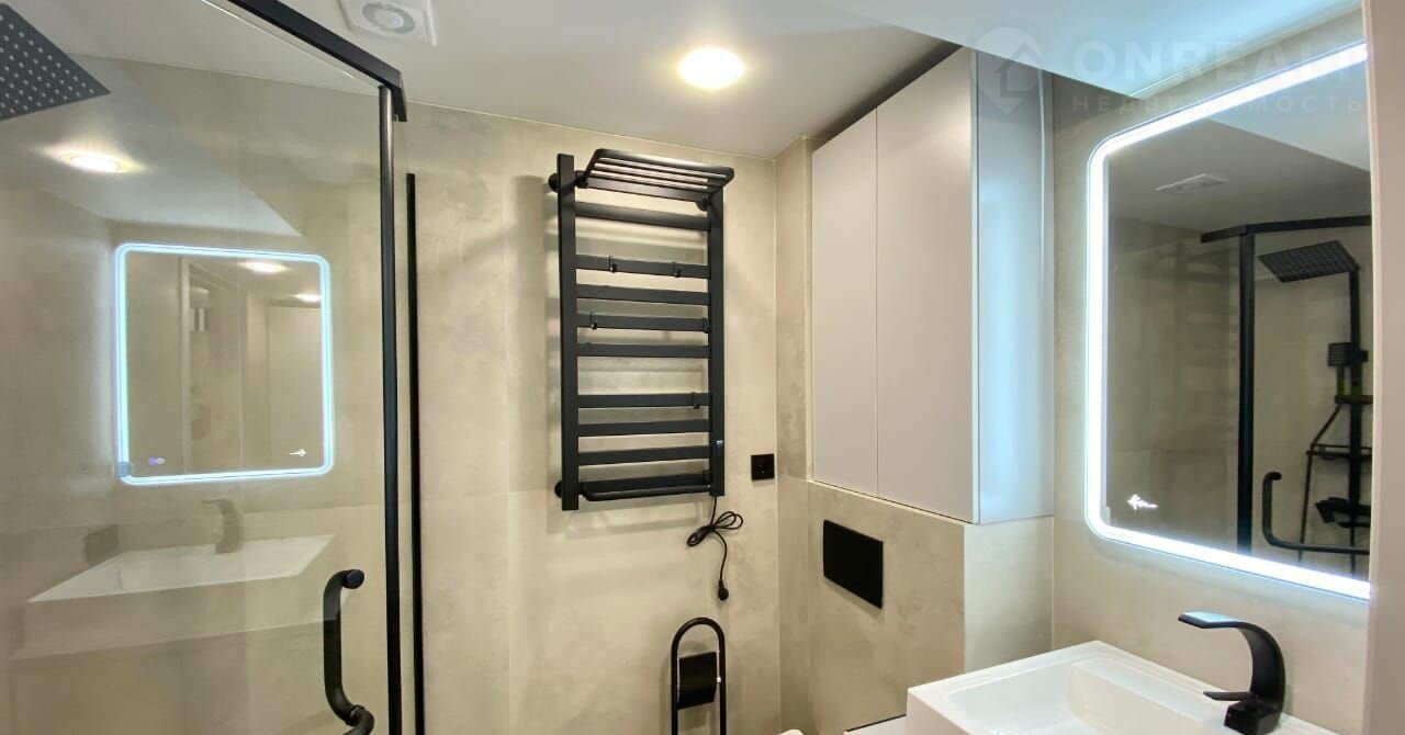 Санузел: Оснащен душевой кабиной, раковиной с зеркалом, унитазом и стиральной машиной.