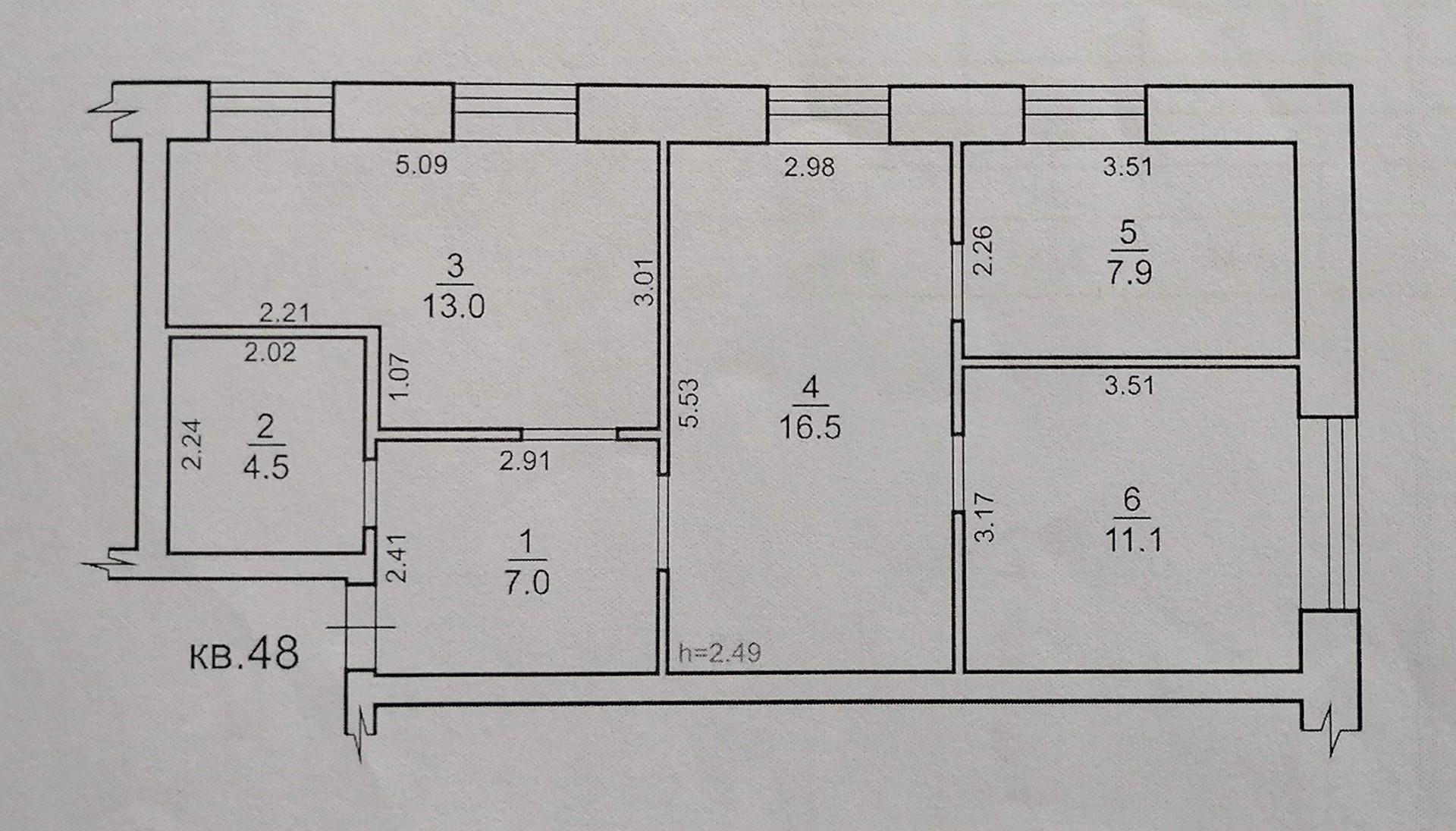 Высота потолков 2.49 м