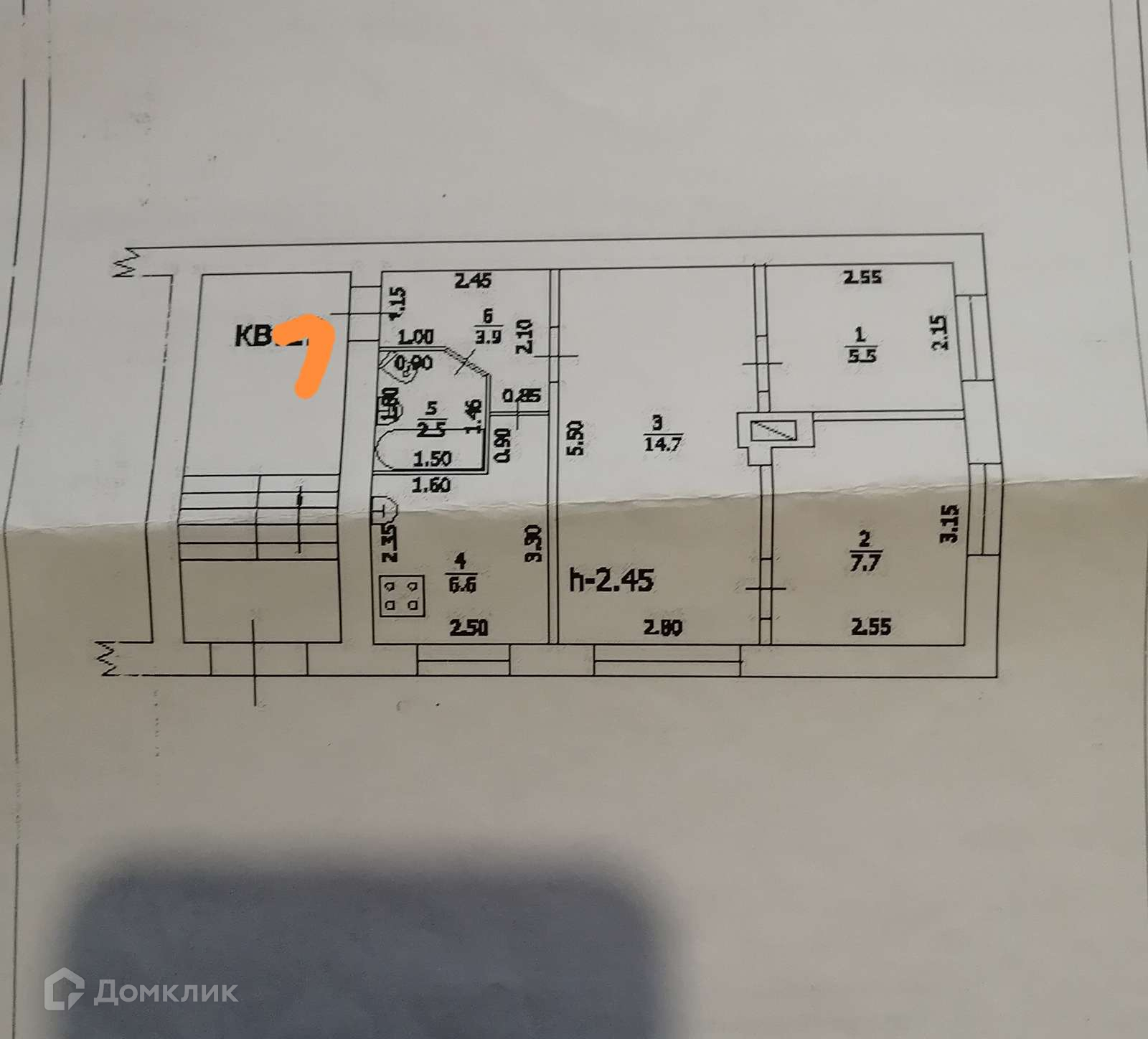 В квартире: 2 спальни (5,5 кв.м. и 7,7 кв.м.)., зал (14,7 кв.м.), кухня (7 кв.м.).