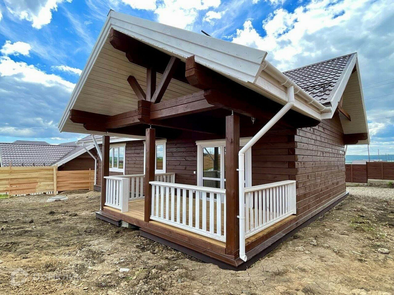 Участок 10 соток, огорожен забором из дерева в стиле «жалюзи», откатные ворота с калиткой.