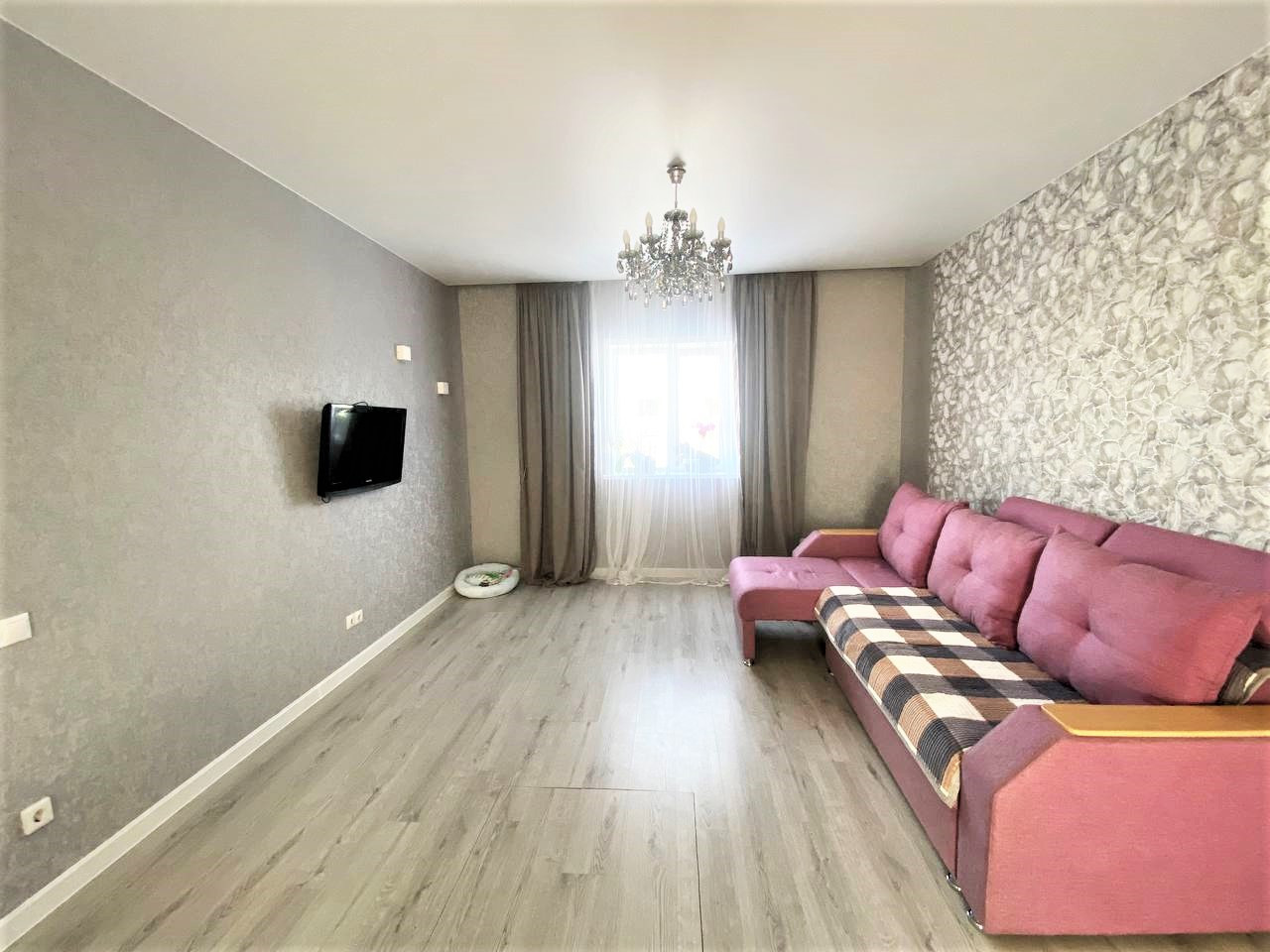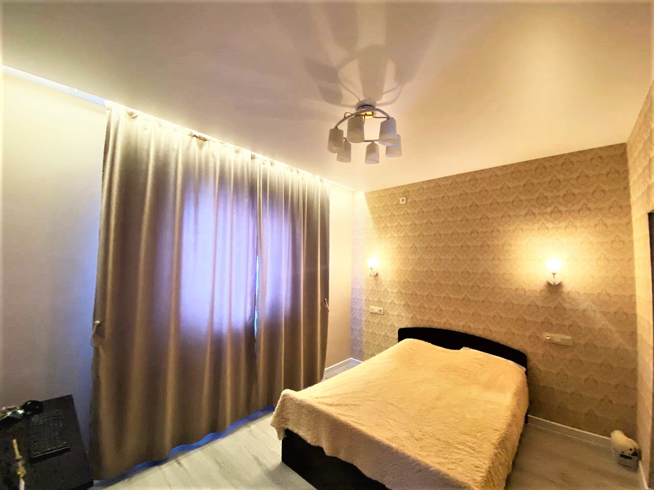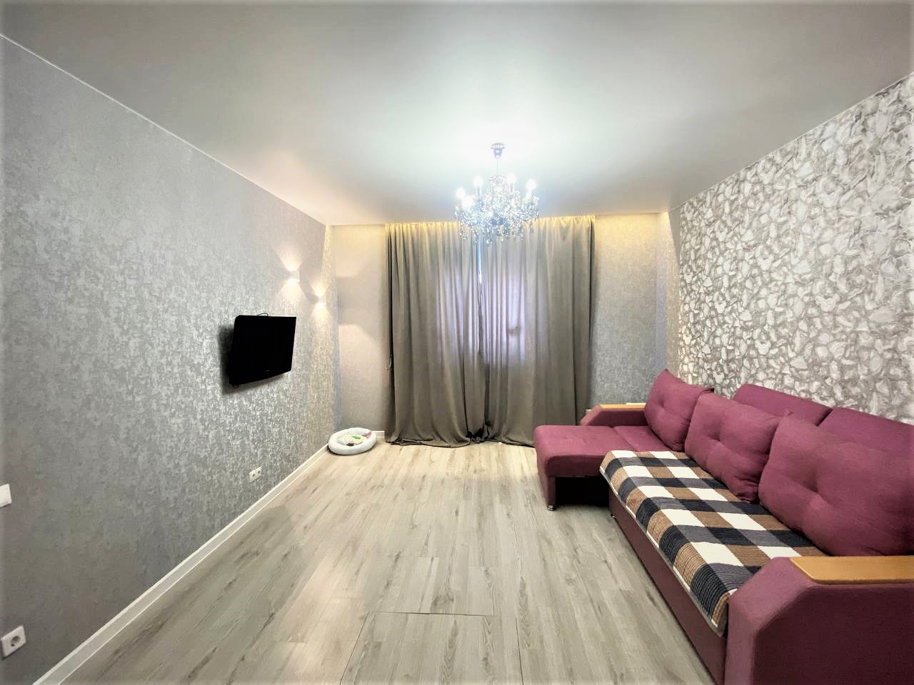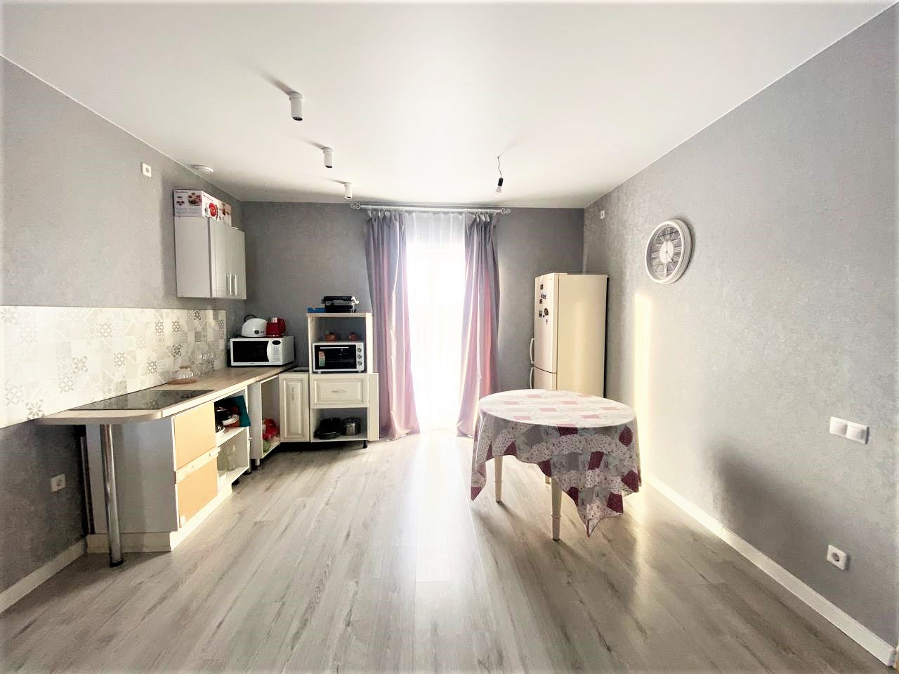 - современный ремонт, стены из ГВЛ, оклеены обоями. На полу ламинат. Натяжной потолок. Совмещенный санузел в керамограните, унитаз-инсталляция. В кухонной зоне окно в пол.