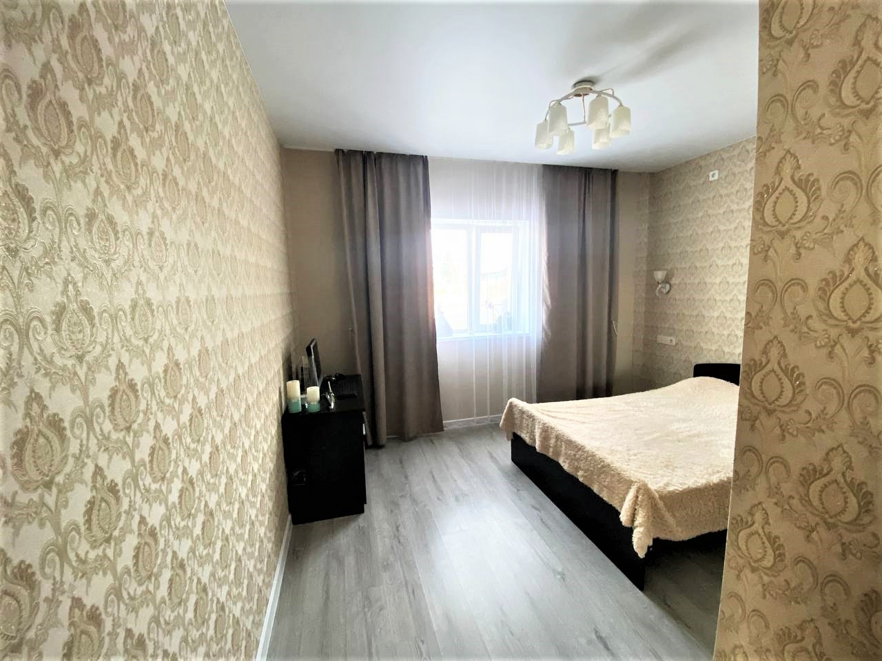 - один этаж, общая площадь 64 мкв. Кухня-гостиная 32,4 мкв(при желании можно сделать еще одну комнату), спальня 15 м2, Совмещённый с/у 7,7м2, техкомната, коридор. Высота потолков 2,8 м.,