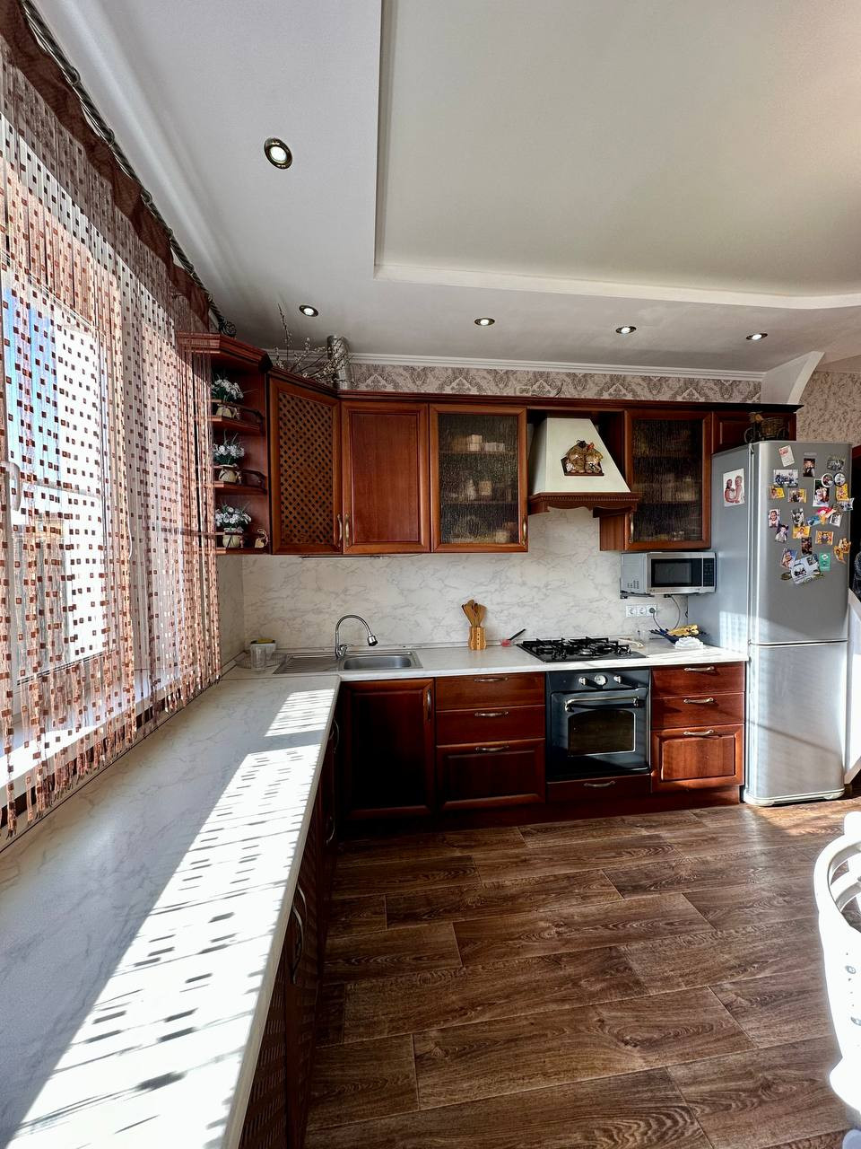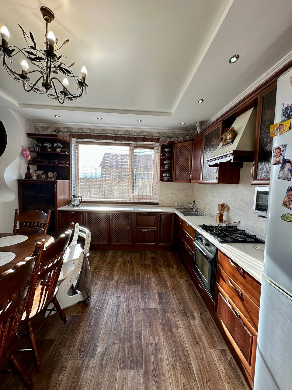 На первом этаже зона гостиной, кухня, сан. узел с душевой кабиной, котельная и выход в гараж. Кухня оборудована всем необходимым (духовой шкаф, варочная панель, вытяжка), итальянские фасады из массива.