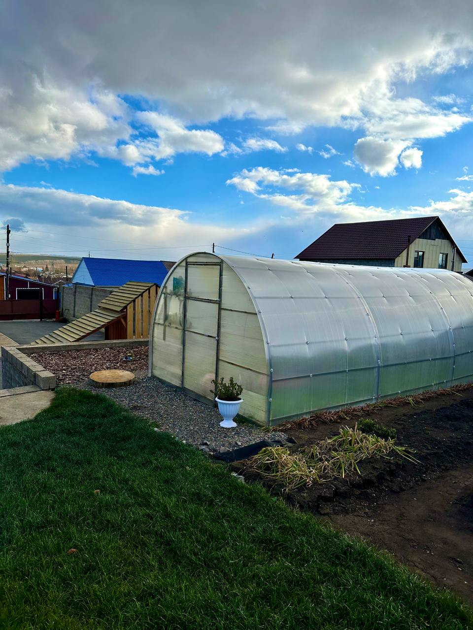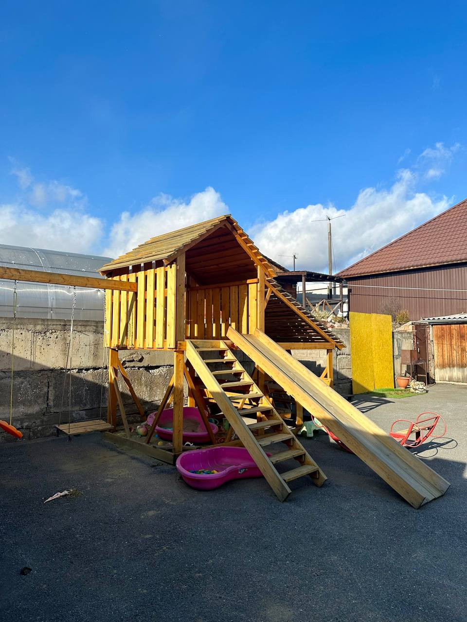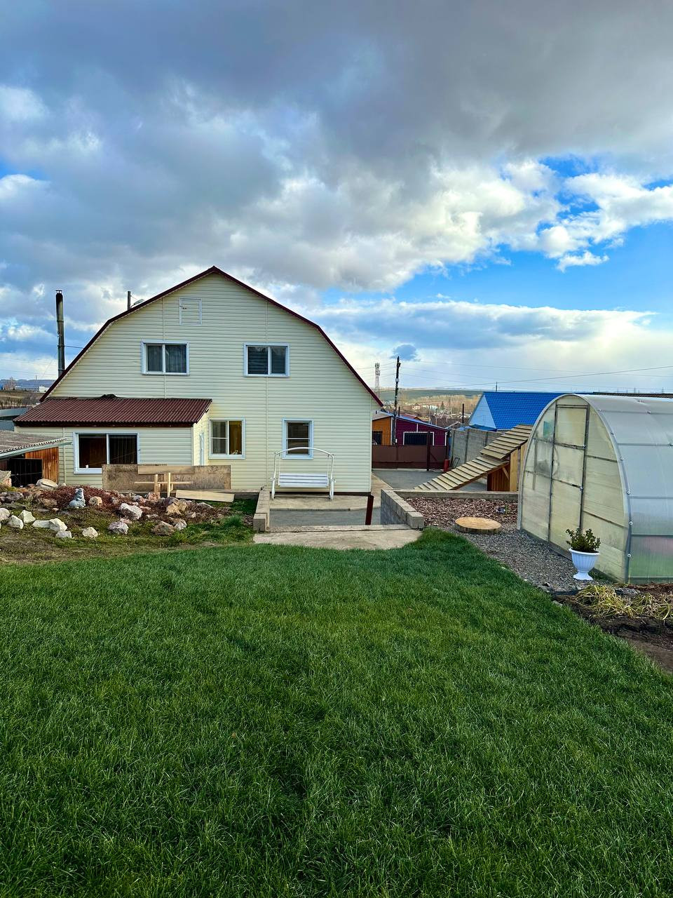 Есть большая уютная баня из бруса (практически новая). Большой детский комплекс с домиком наверху (мечта любого ребёнка), горкой, качелей. Придомовая территория полностью благоустроена, газоны, растения, клумбы, большой огород и новая теплица. Подъезд к участку с двух сторон.