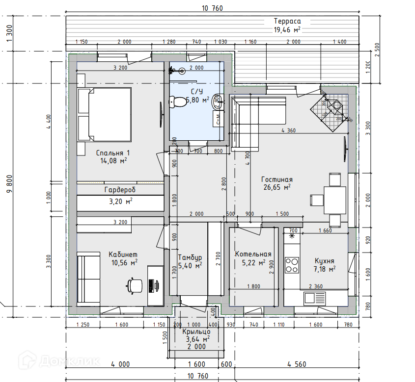 Планировка дома включает в себя просторную гостиную, 2 отдельные спальные комнаты со встроенной гардеробной, уютную кухню, а также шикарную террасу.