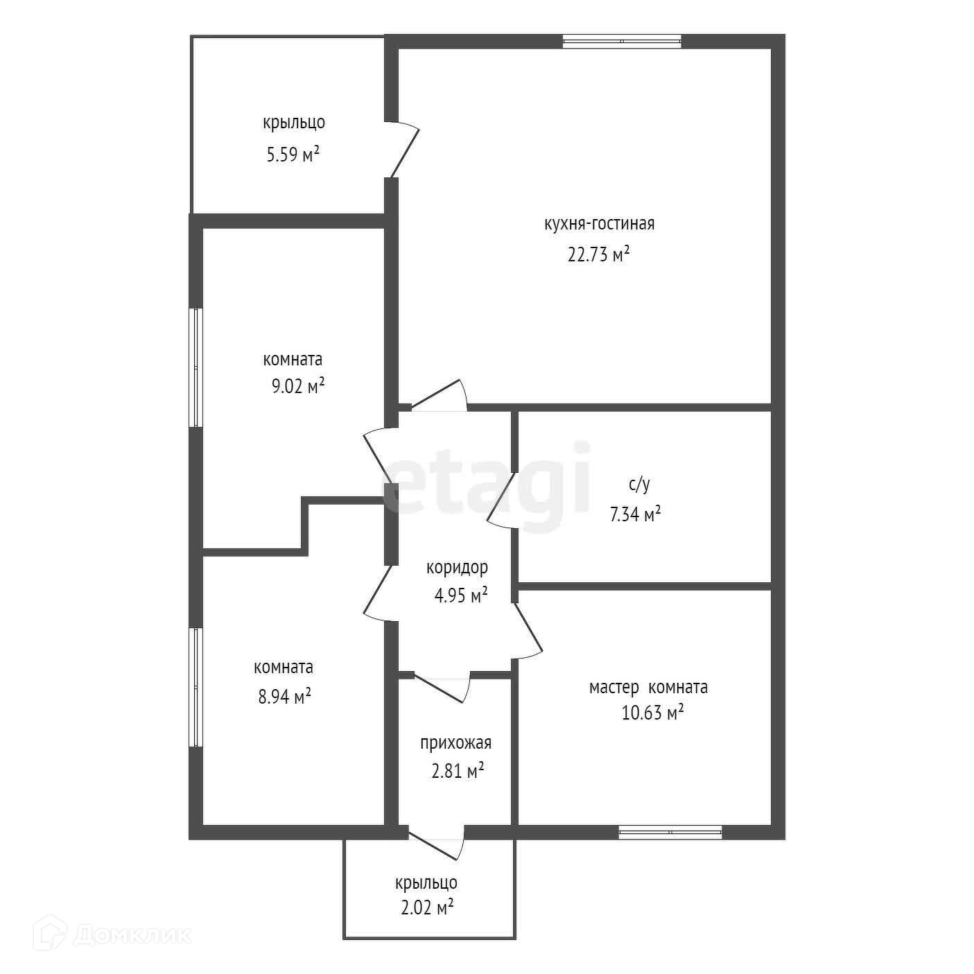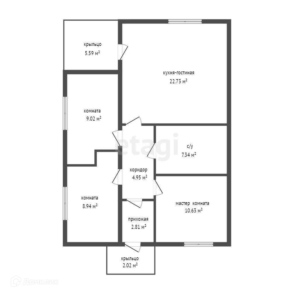 Общая площадь дома 65 м2. В доме находится прихожая (2.81 м2), коридор (4.95 м2), а также 3 отдельных спальни площадью 8.94, 9.02, 10.63 м2 и совмещённый санузел (7.34 м2). Помимо этого в доме есть просторная кухня-гостиная (22.73 м2) из которой можно выйти на крытую террасу-крыльцо (5.59 м2).