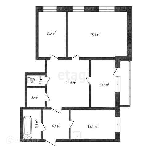 от застройщика, в которой большая ванная комната 5,3 кв., большой сан. Узел 3кв., так же есть
