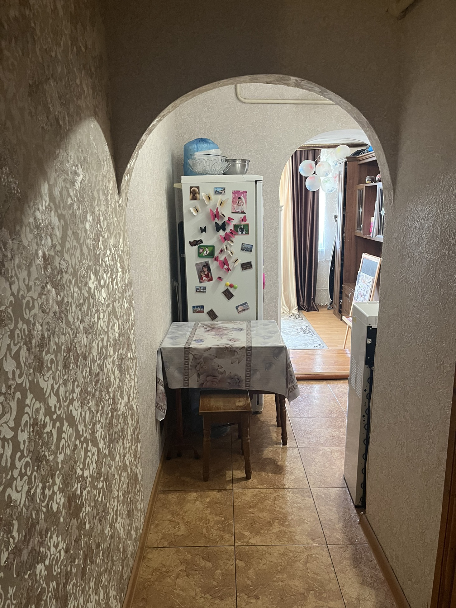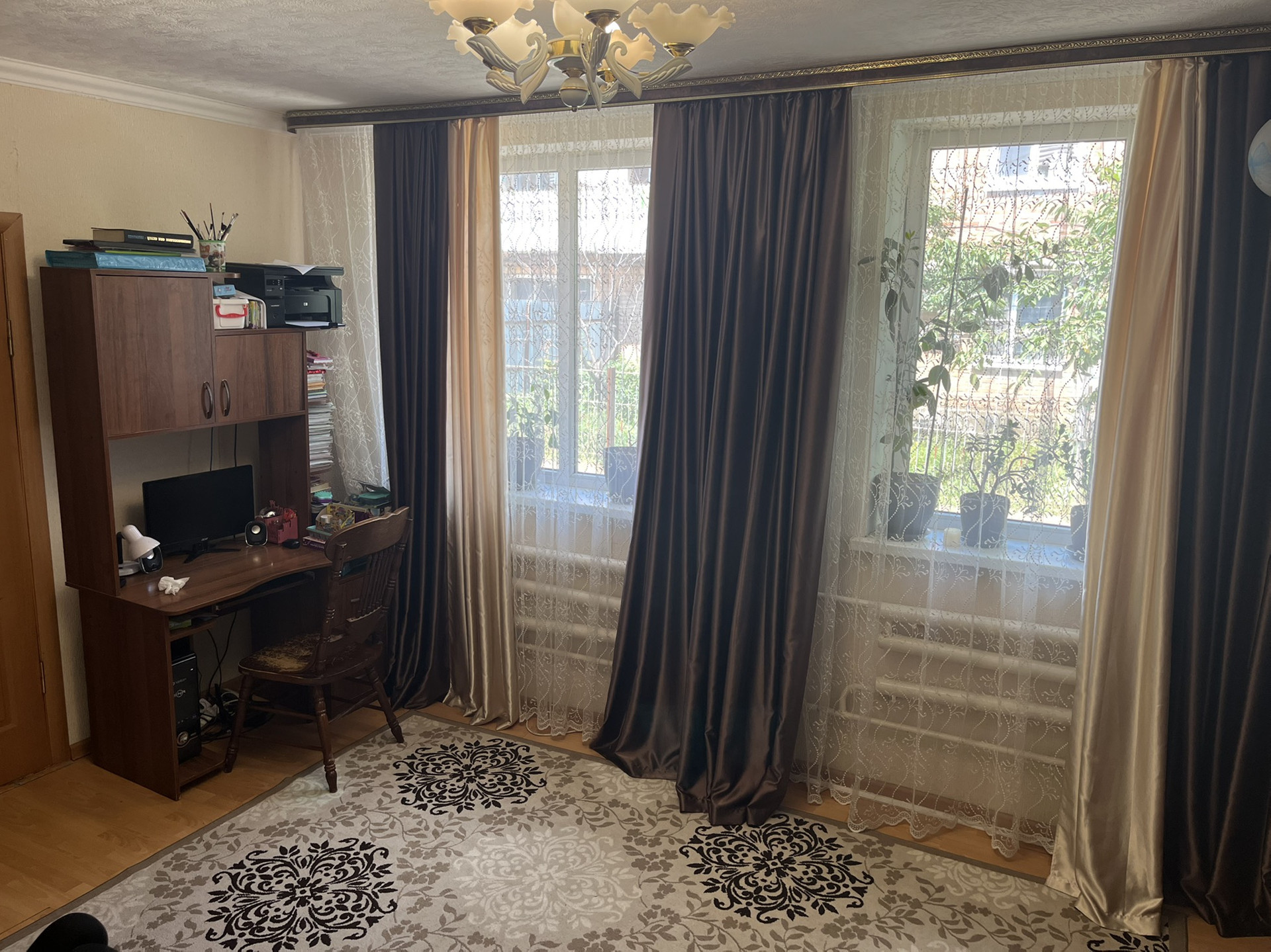 Продаётся 4 комнатная квартира, 3 из которых изолированы. Общая площадь 69,9 кв.м. Под окном имеется небольшой бетонирований участок, с установлеными металическими столбами. Квартира расположена на 1 этаже 2 этажного кирпичного дома. Центральное отопление, газ.