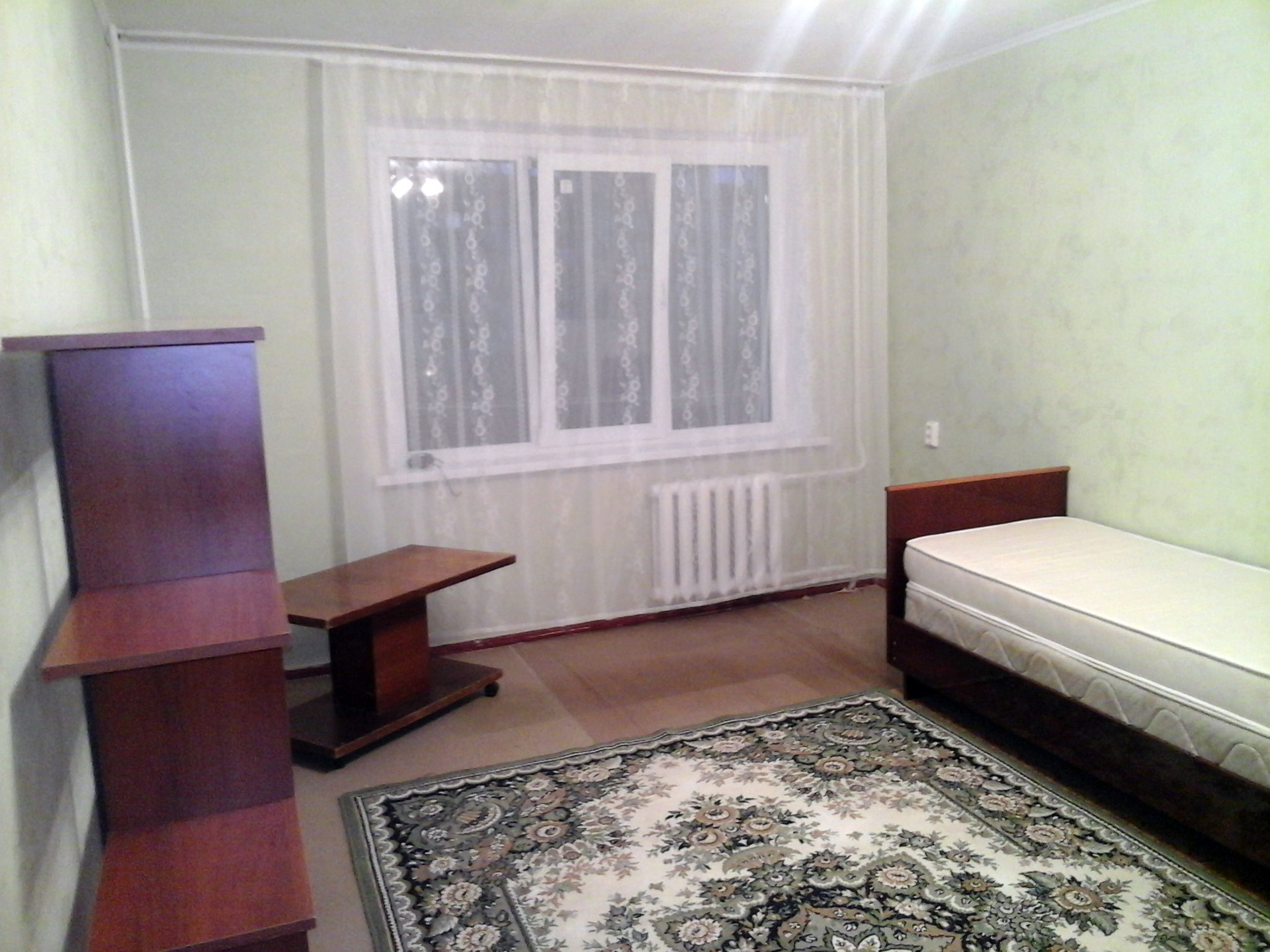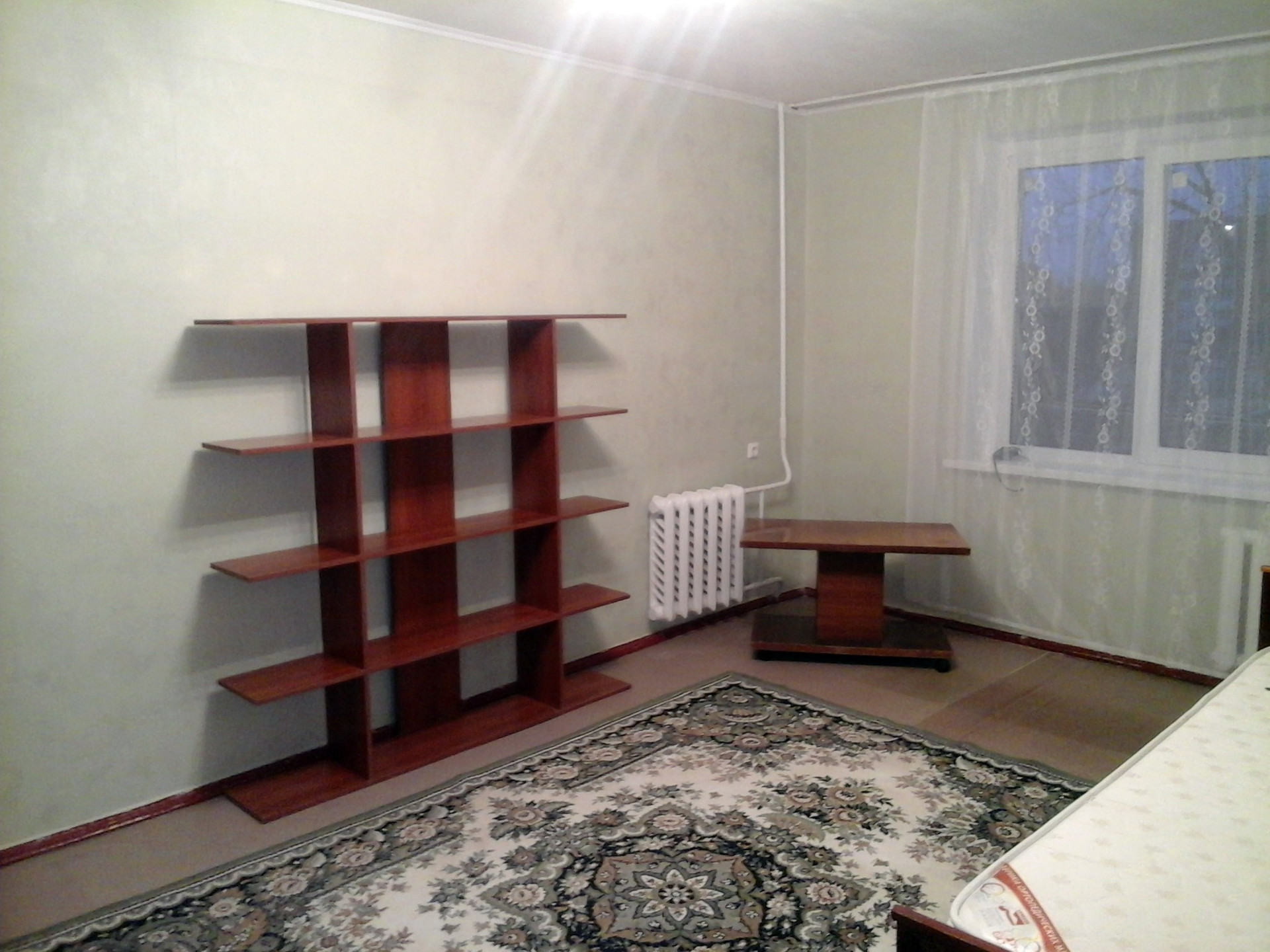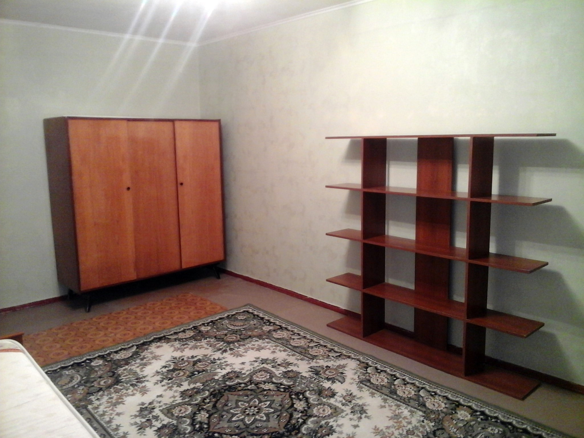 - оставим 2 кресла - кровати и диван (требует замены поролона и перетяжки), цв. телевизор + тумбу под ТВ, стеллаж / книжн.полку, стул;