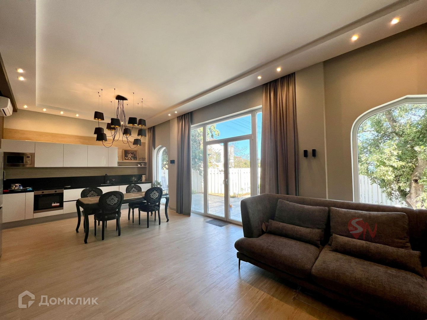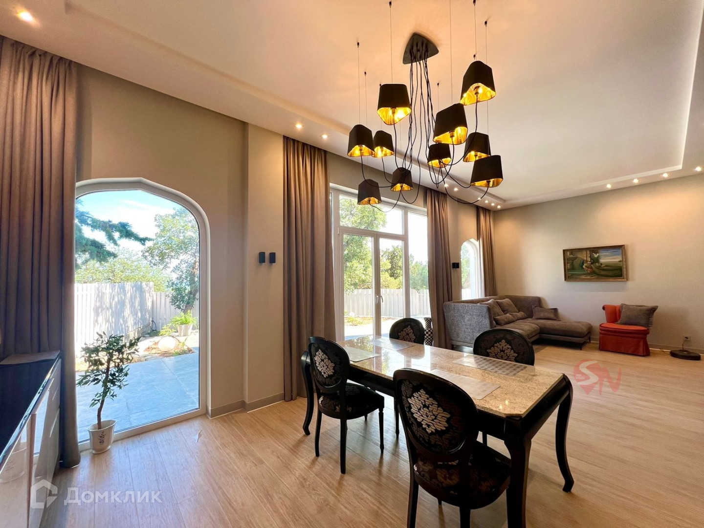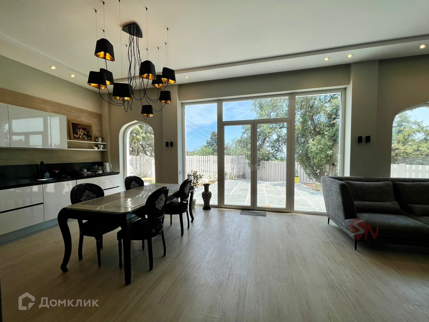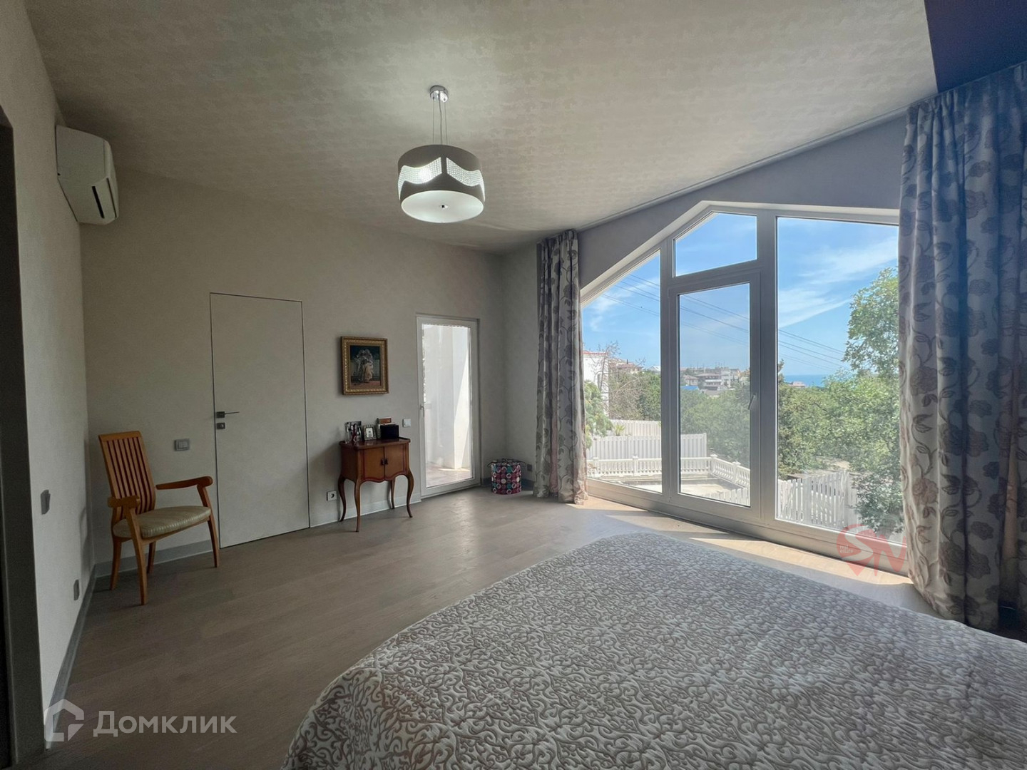 В доме сделан новый дизайнерский ремонт, укомплектован мебелью.  Гостиная расположенная на первом этаже дома очень просторная и светлая благодаря панорамным окнам и высоте потолков 3,8 м. Второй этаж занимают спальни и гостевая комната, детская и мастер-спальня с балконом. Вид на море со второго этажа.  Мансардный этаж -  спальня  с санузлом и выход на террасу  площадью 30 кв.м.  Преимуществами террасы-солярия является высота стен, скрывающая вас от глаз соседних домов  и прекрасные пейзажи на море и верхушки Ай-Петри. На террасу выведен душ, что позволяет с комфортом принимать солнечные ванны.