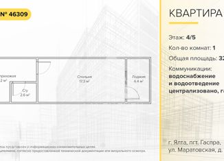 Объект № 46309 Предлагаем Вашему вниманию отличную видовую 1-комнатную квартиру в городе Ялта, поселок городского типа Гаспра, улица Маратовская, дом 53. Расположена на 4 этаже 5-этажного дома. Общая площадь квартиры 32,0 кв.м., где кухня 3,8 кв.м., спальная комната 17,3 кв.м. Квартира отлично подойдет для личного проживания, а также может приносит... |