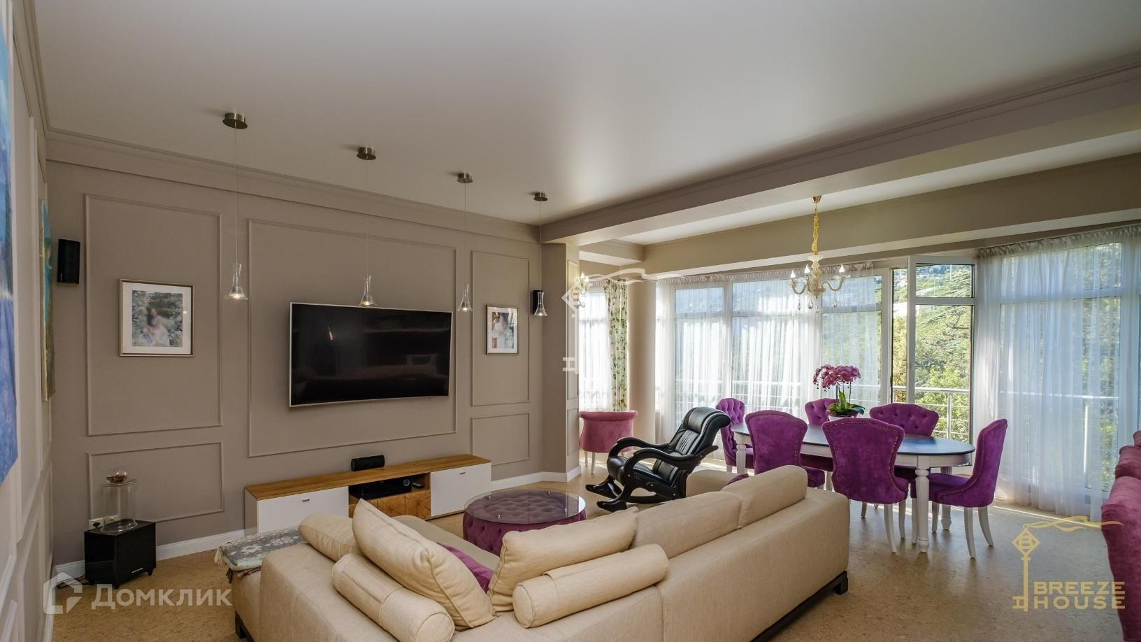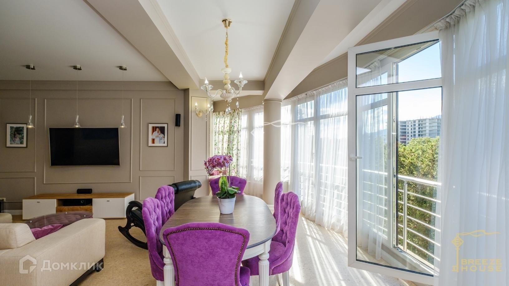 В гостиной имеется французский балкон, благодаря чему можно открывать окна в пол на распашку и наслаждаться прекрасными видами на горы и парк;