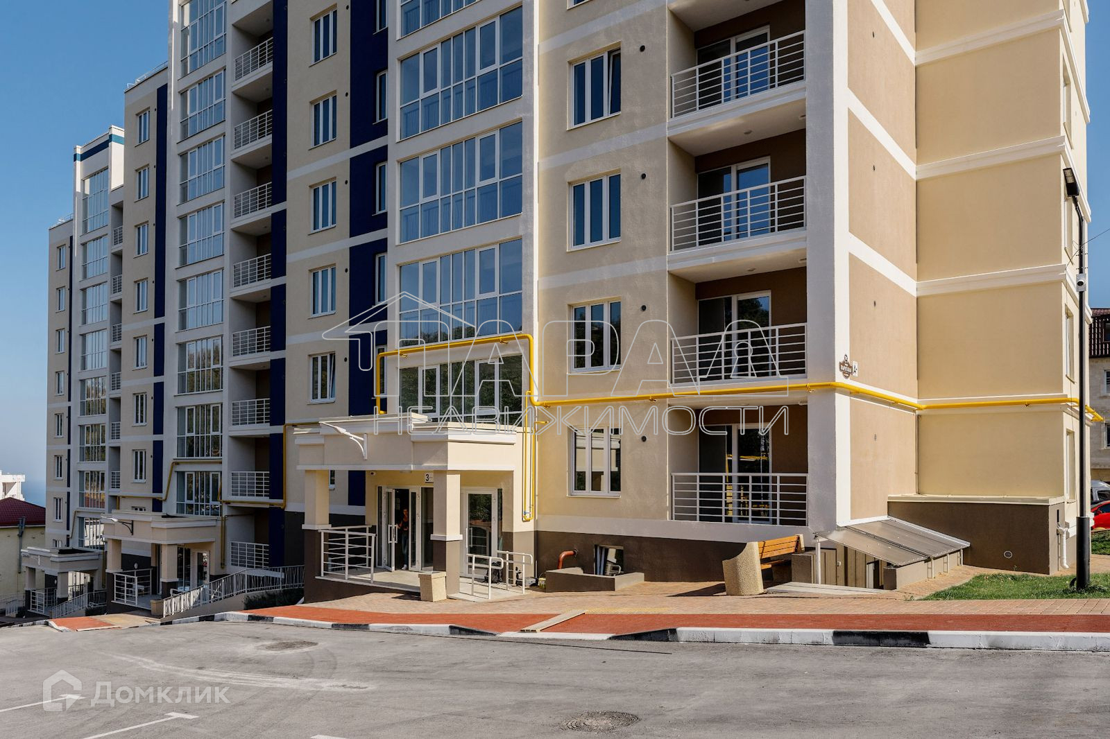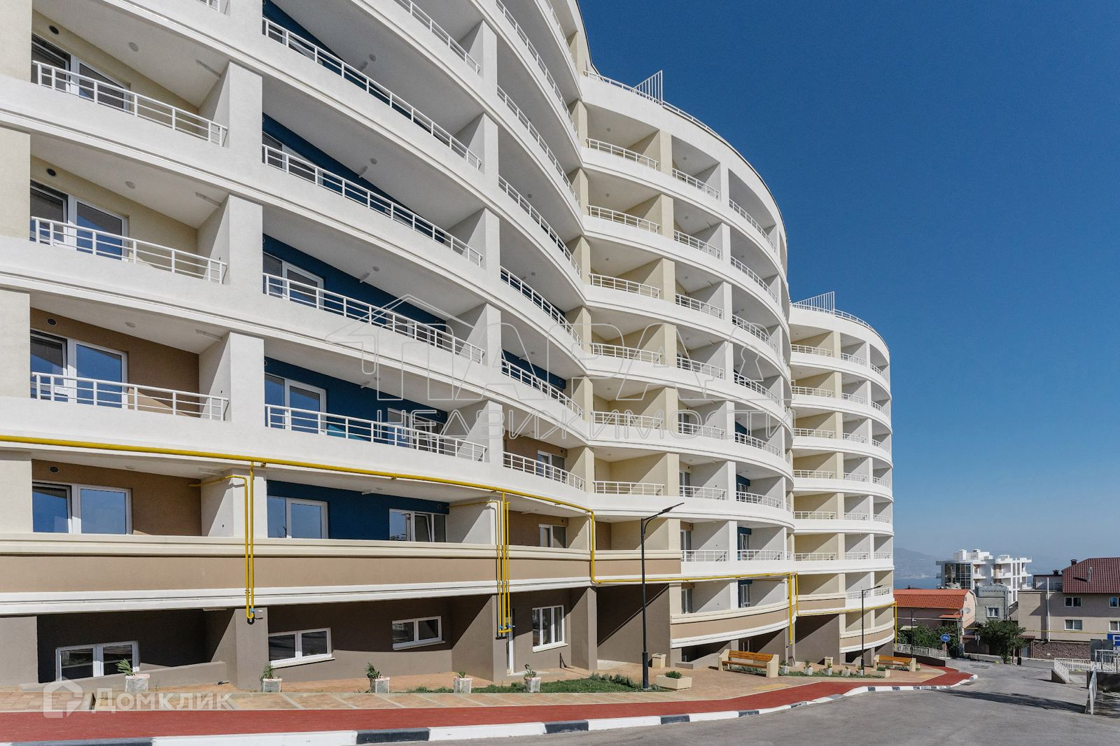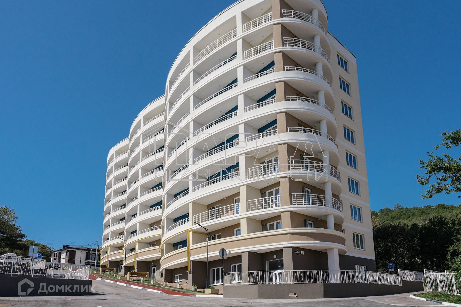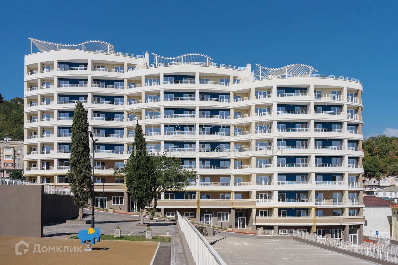 выход на крышу. Всего 104 квартиры. На придомовой территории бесплатная парковка на 95 машин, детская площадка, спортивная площадка, велодорожка, магазины, кафе. Комплекс расположен в п. Стройгородок (пгт Гаспра), в котором имеется свои школа, детский сад, тренажерный зал, продуктовые магазины, супермаркеты, почта, аптека,