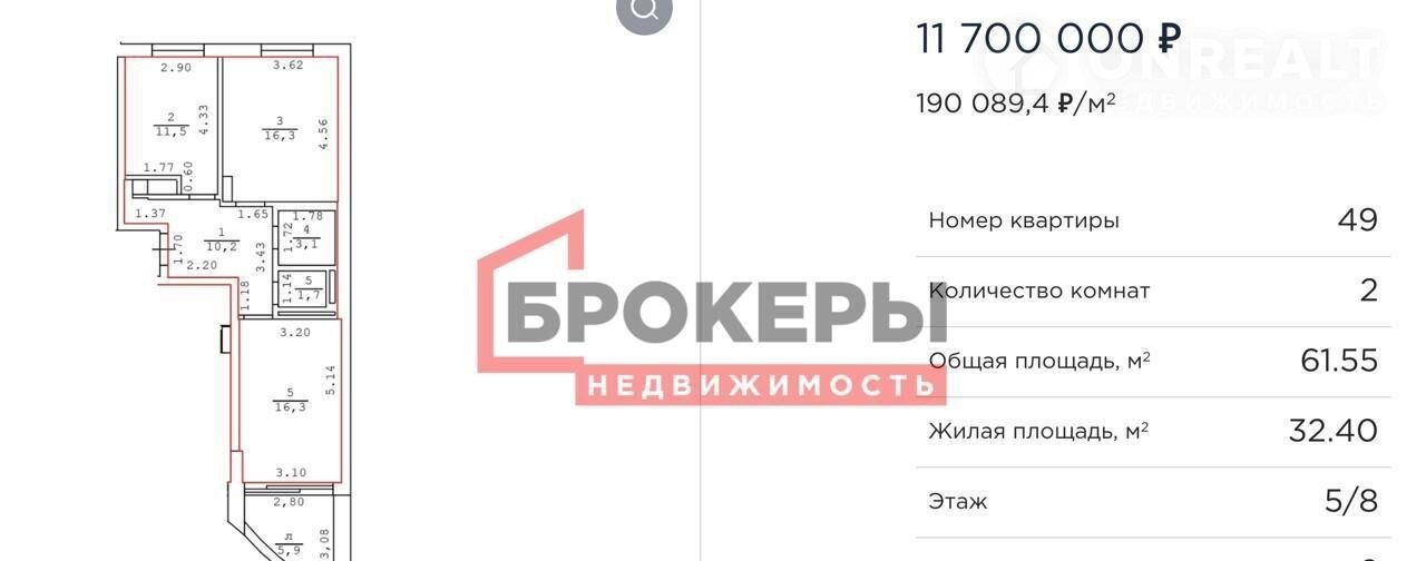 Общая площадь 61.6 м2