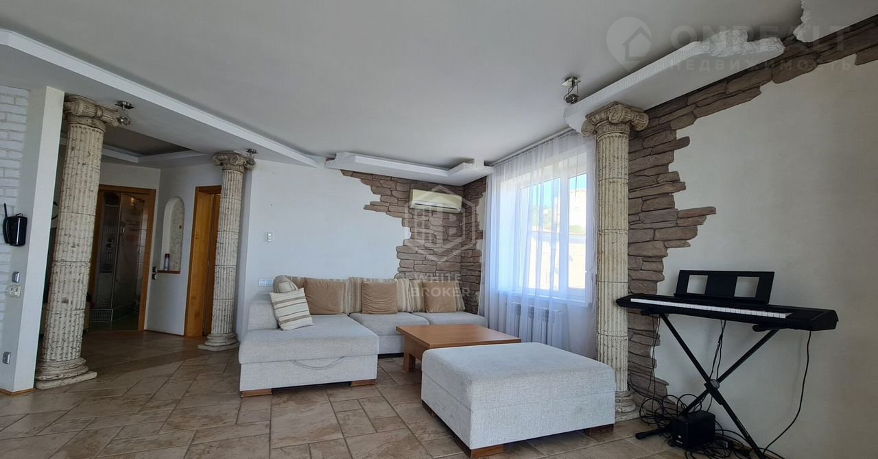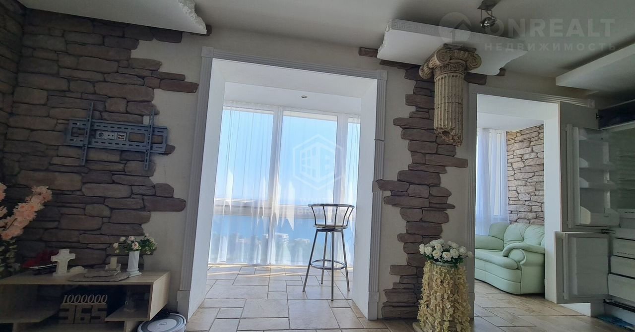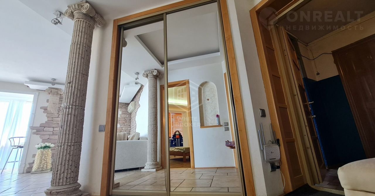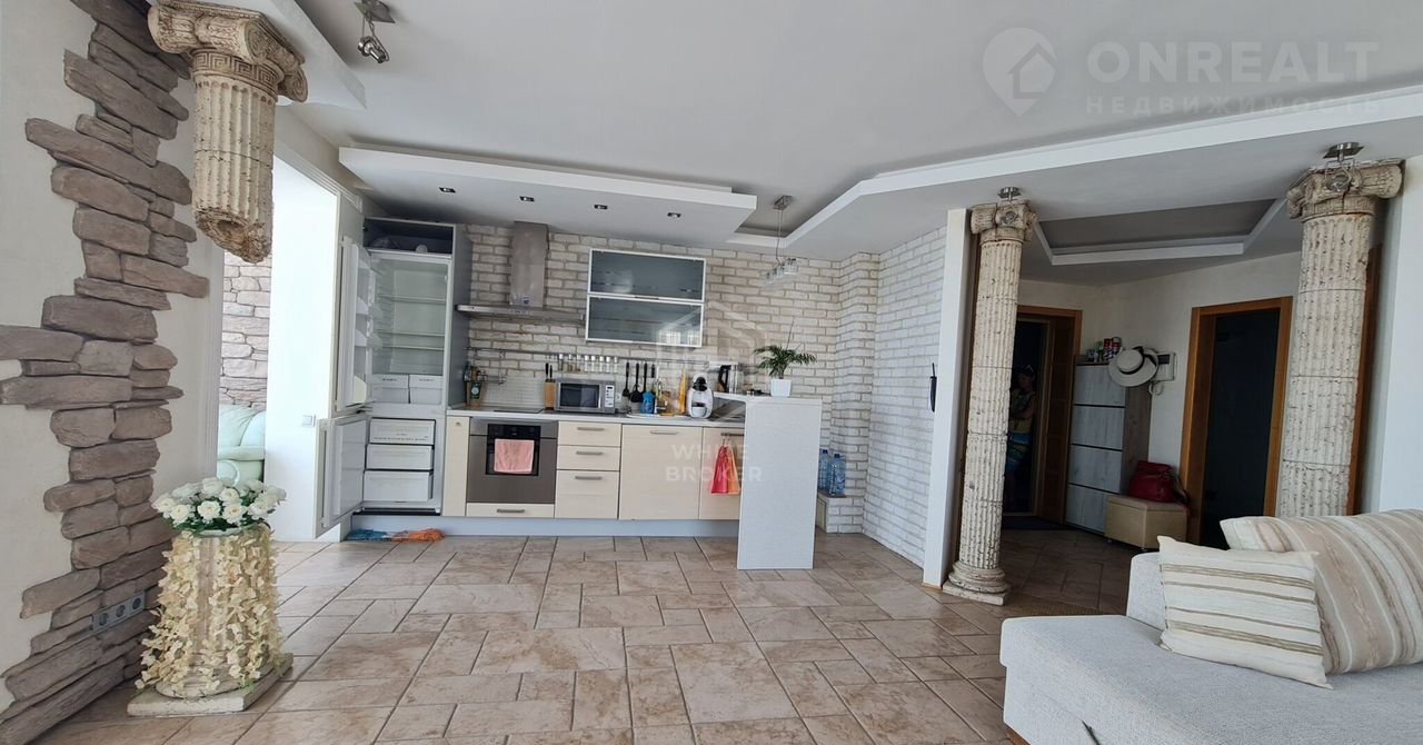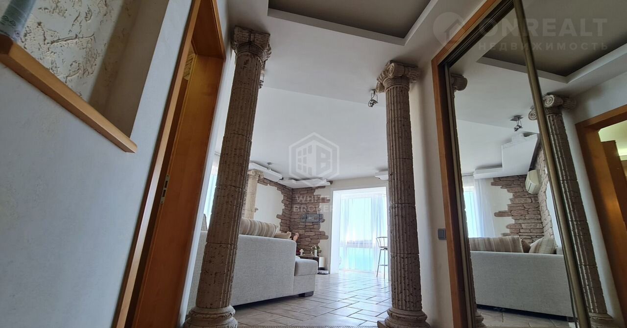 Красивый дизайнерский ремонт из натуральных экологически чистых материалов.  Современные светильники и отделка камнем, колоны в древнеримском стиле.