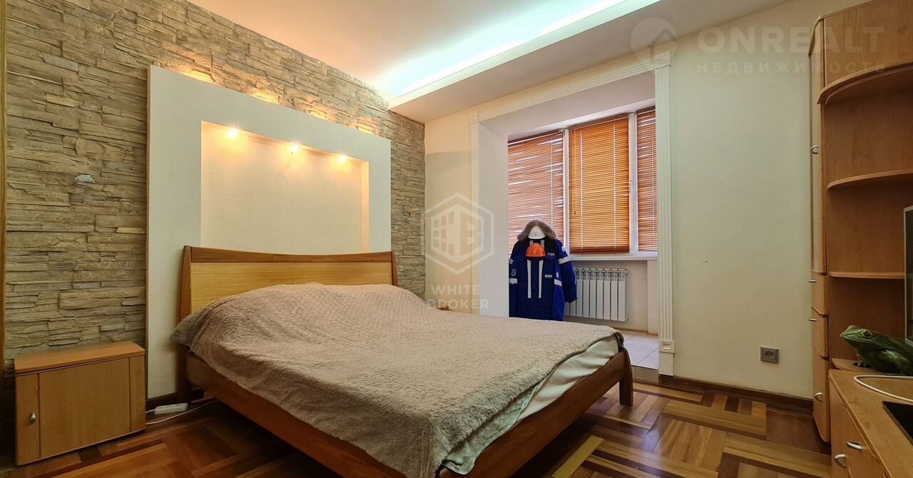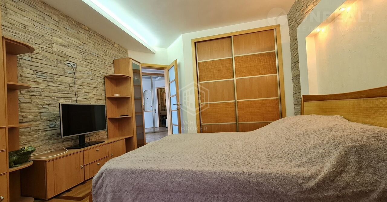 Спальная комната имеет двуспальную кровать, встроенный шкаф-купе, деревянная отделка и подсветка создают уют и располагают к отдыху.