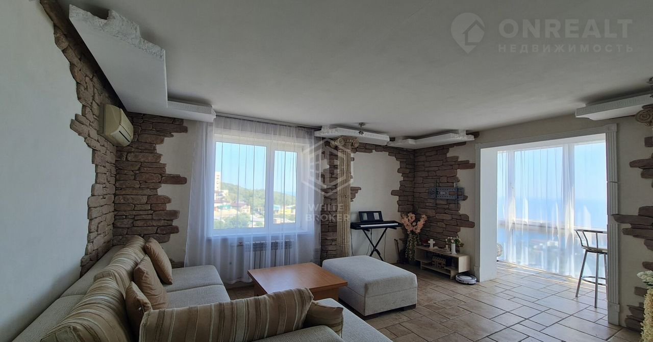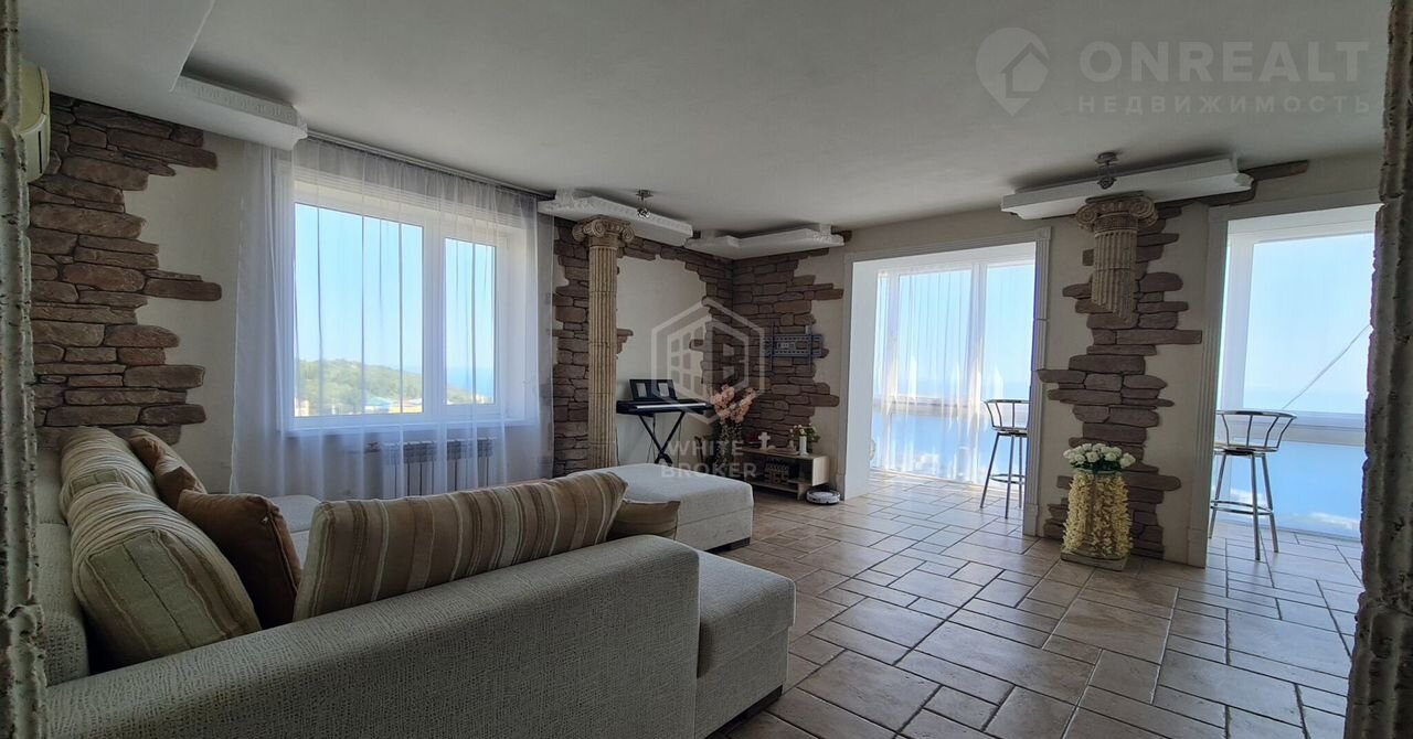 Лоджия объединенная с гостинной. Остекление в пол с местами отдыха и прекрасным видом на Гаспру, мореи горы.