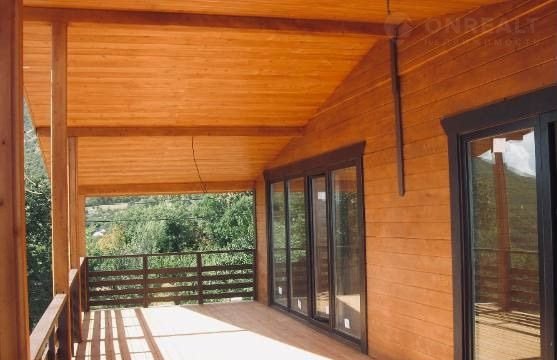 Этот уникальный двухэтажный дом сочетает в себе прочность и надёжность камня на первом этаже с теплотой и уютом клеенного закарпатского бруса на втором.