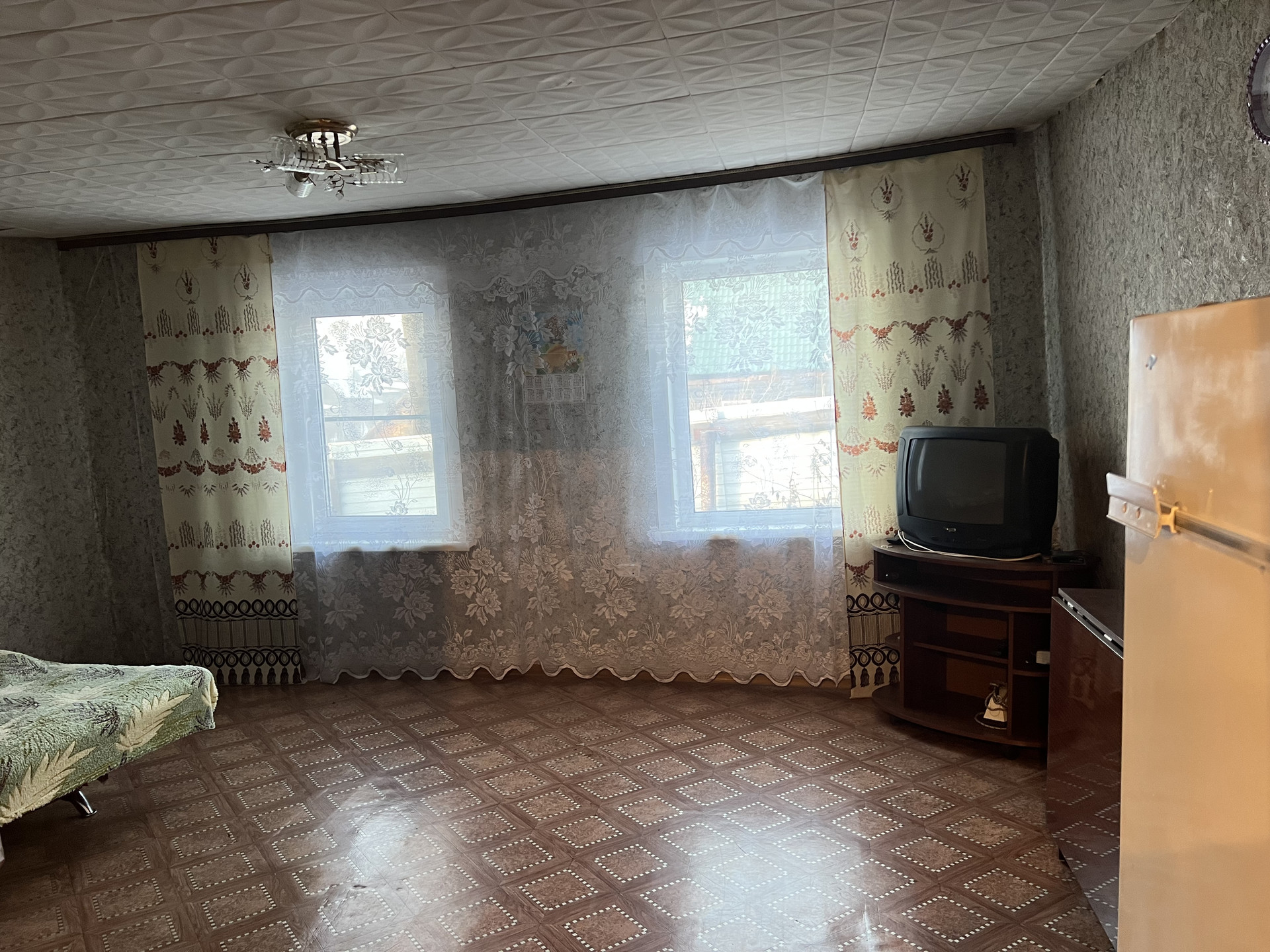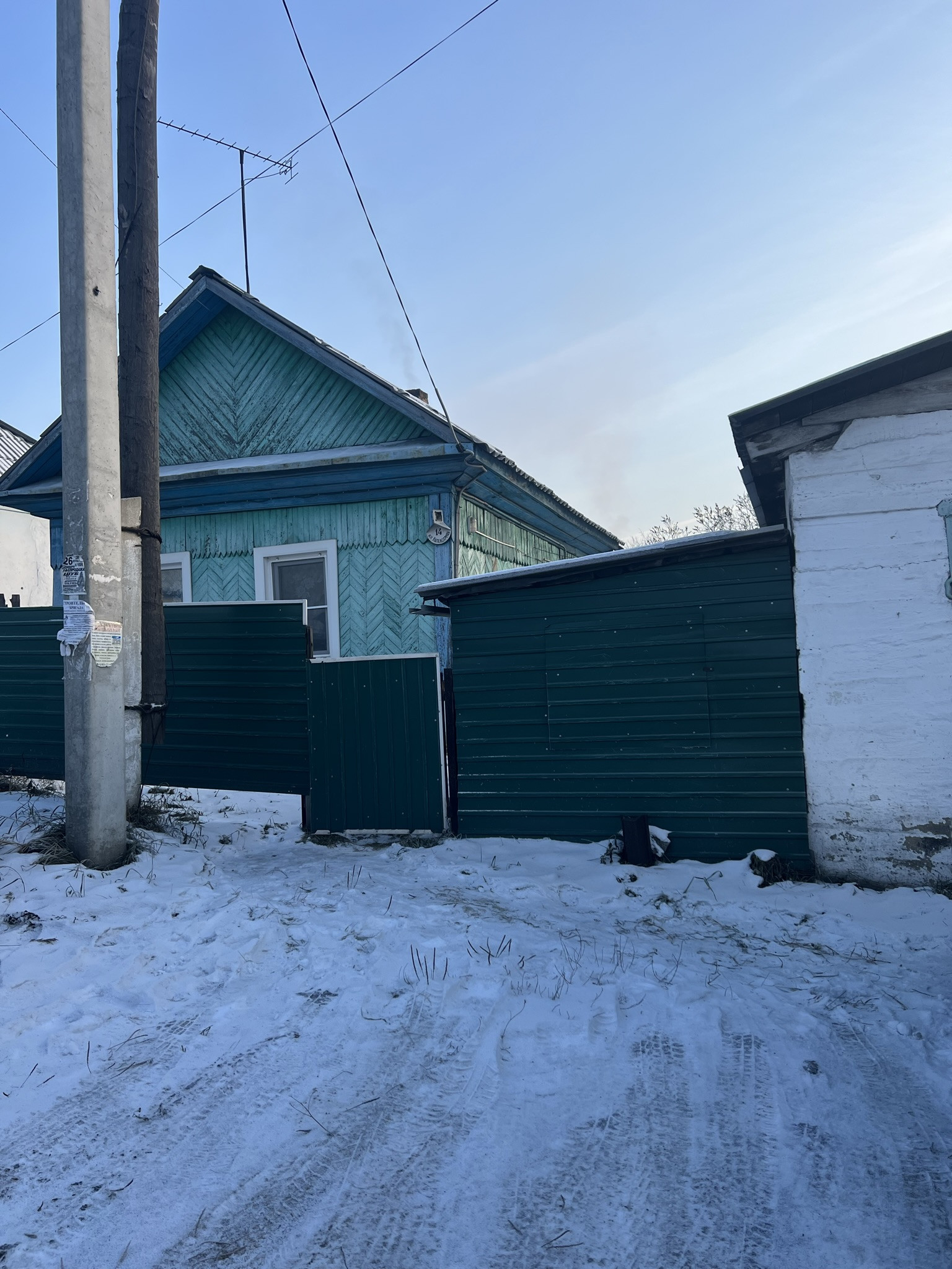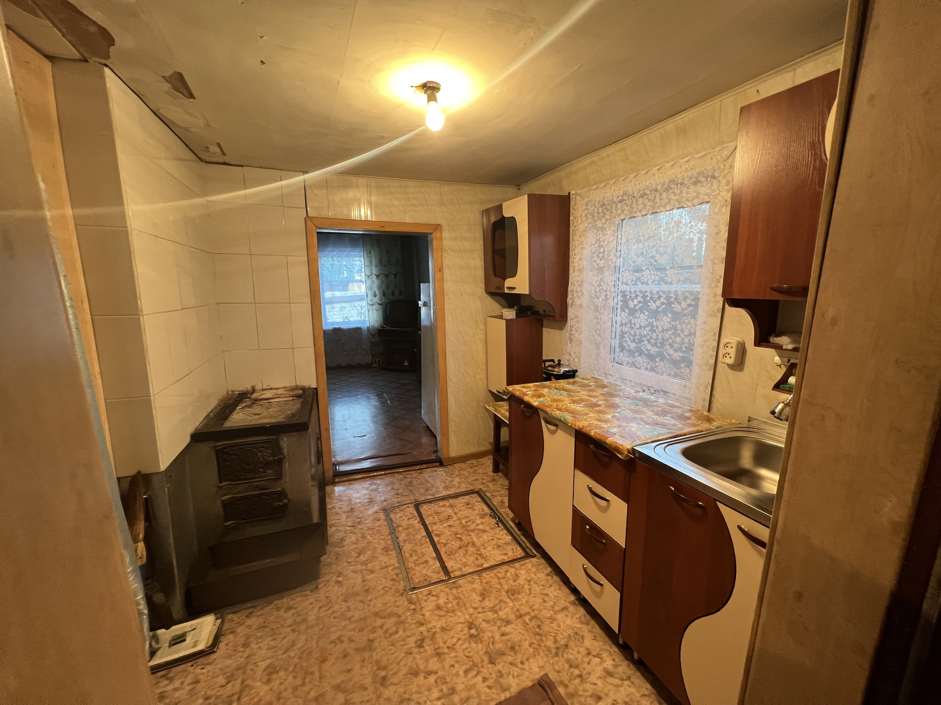1 комната, кухня, ванная комната (душевой уголок, раковина, унитаз) В доме вода, слив. Окна пластиковые. Отопление печное. На участке гараж, погреб в гараже, баня, сарай, углярка. Огород ровный, с плодовыми деревьями и кустарниками. В шаговой доступности остановка общественного транспорта, магазин.