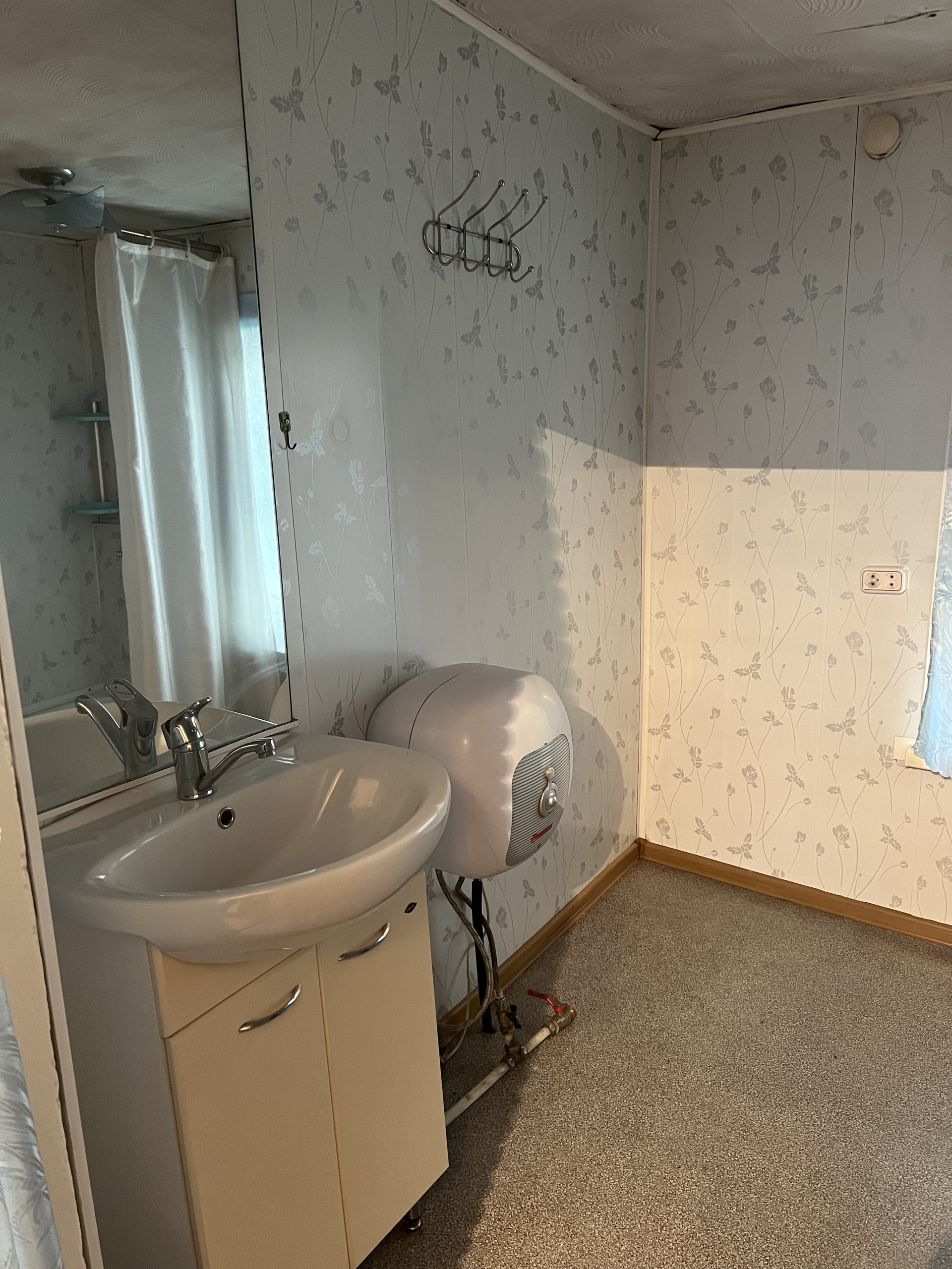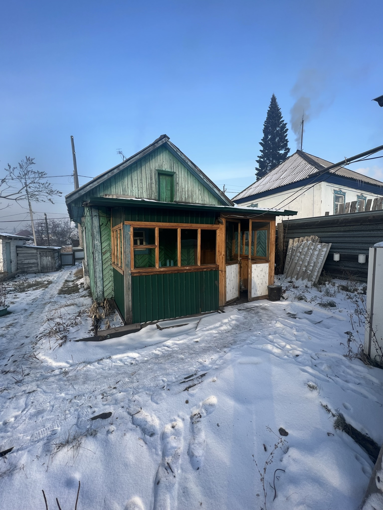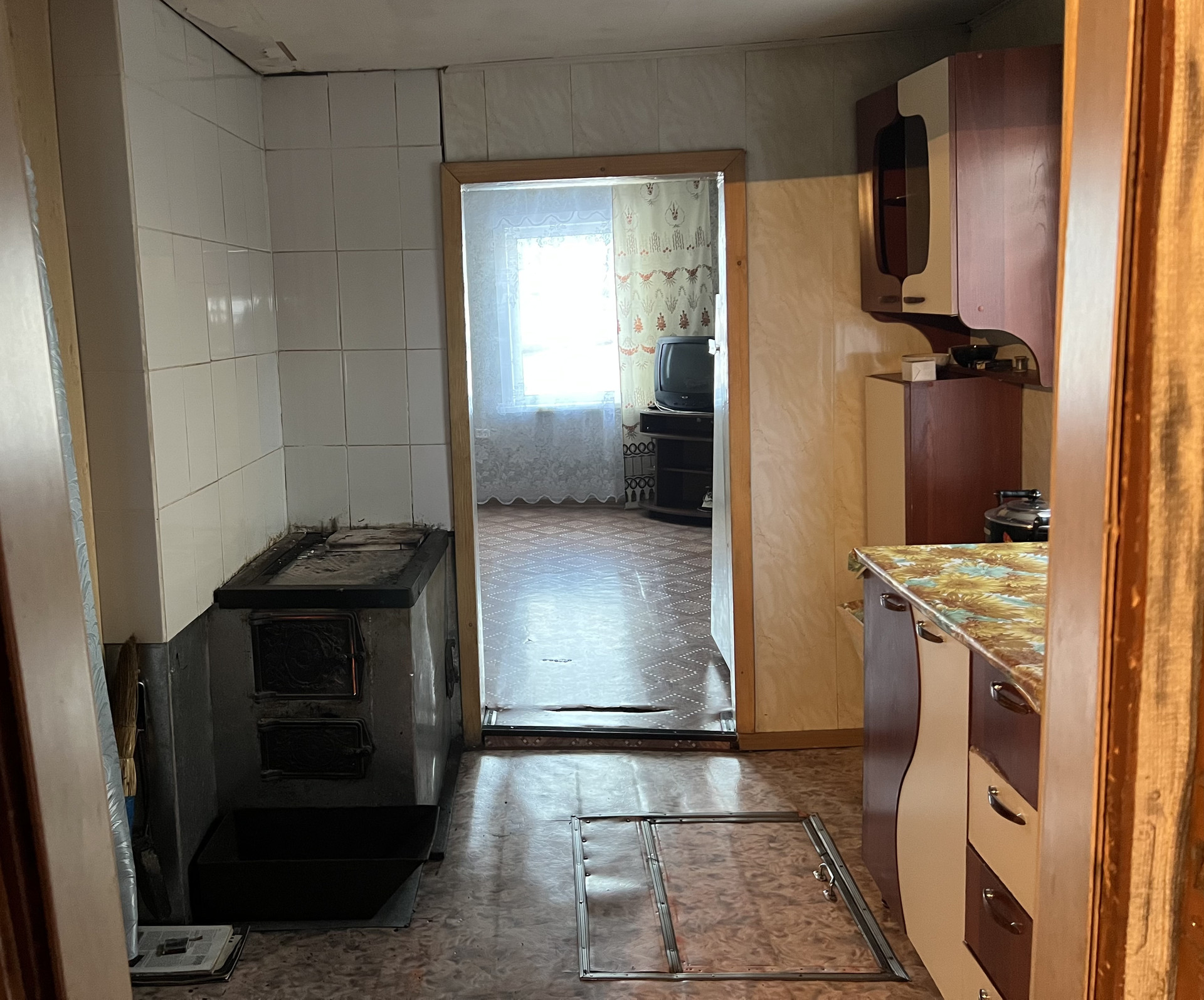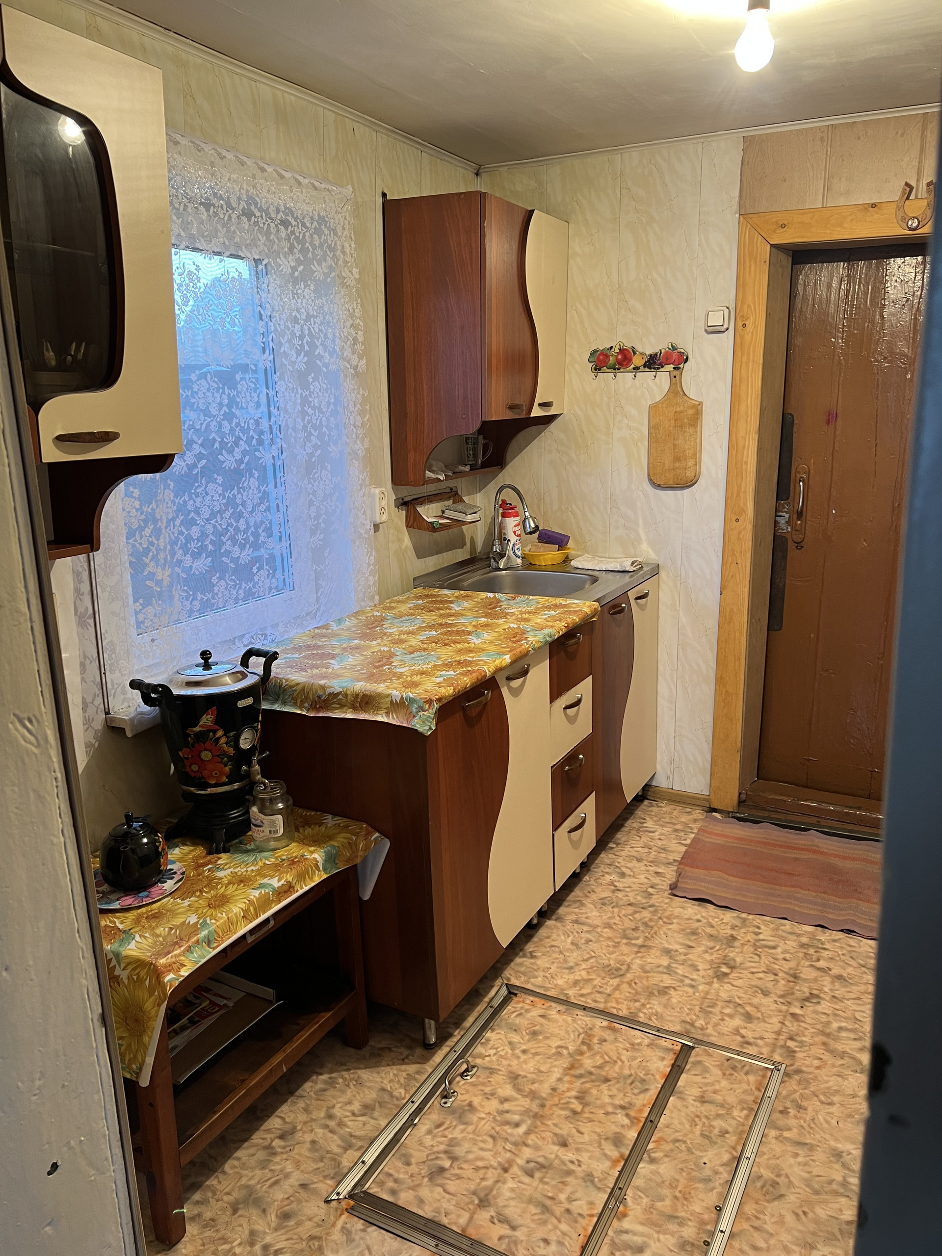 1 комната, кухня, ванная комната (душевой уголок, раковина, унитаз) В доме вода, слив. Окна пластиковые. Отопление печное. На участке гараж, погреб в гараже, баня, сарай, углярка. Огород ровный, с плодовыми деревьями и кустарниками. В шаговой доступности остановка общественного транспорта, магазин.