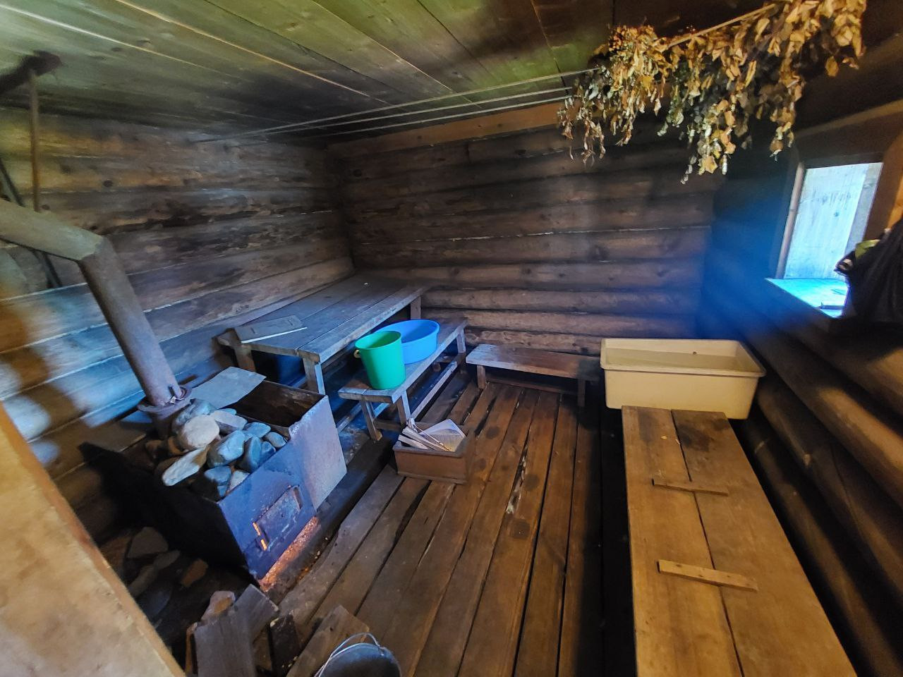 Баня бревенчатая с предбанником, печное отопление, полок, лавки деревянные, под полом слив.