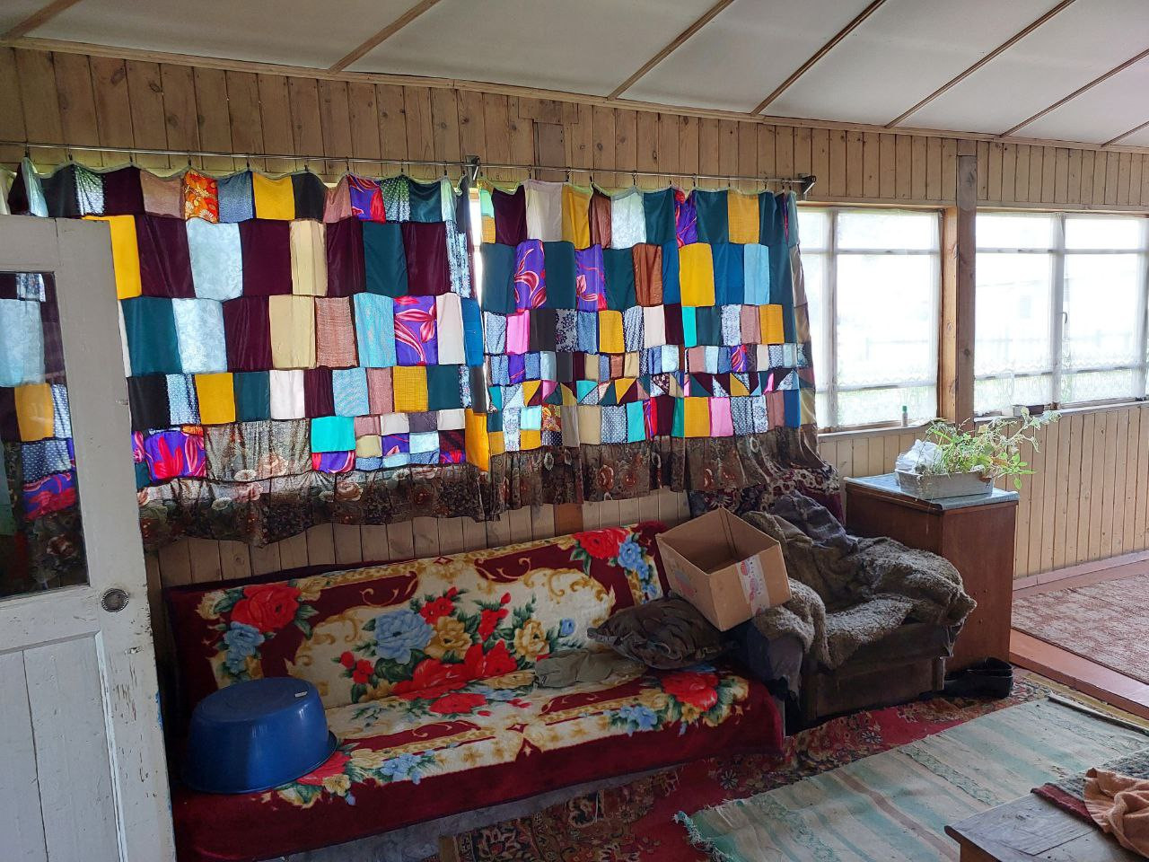 Веранда крытая застеклённая холодная, объединяет дом с летней кухней, на ней диван, лавки.