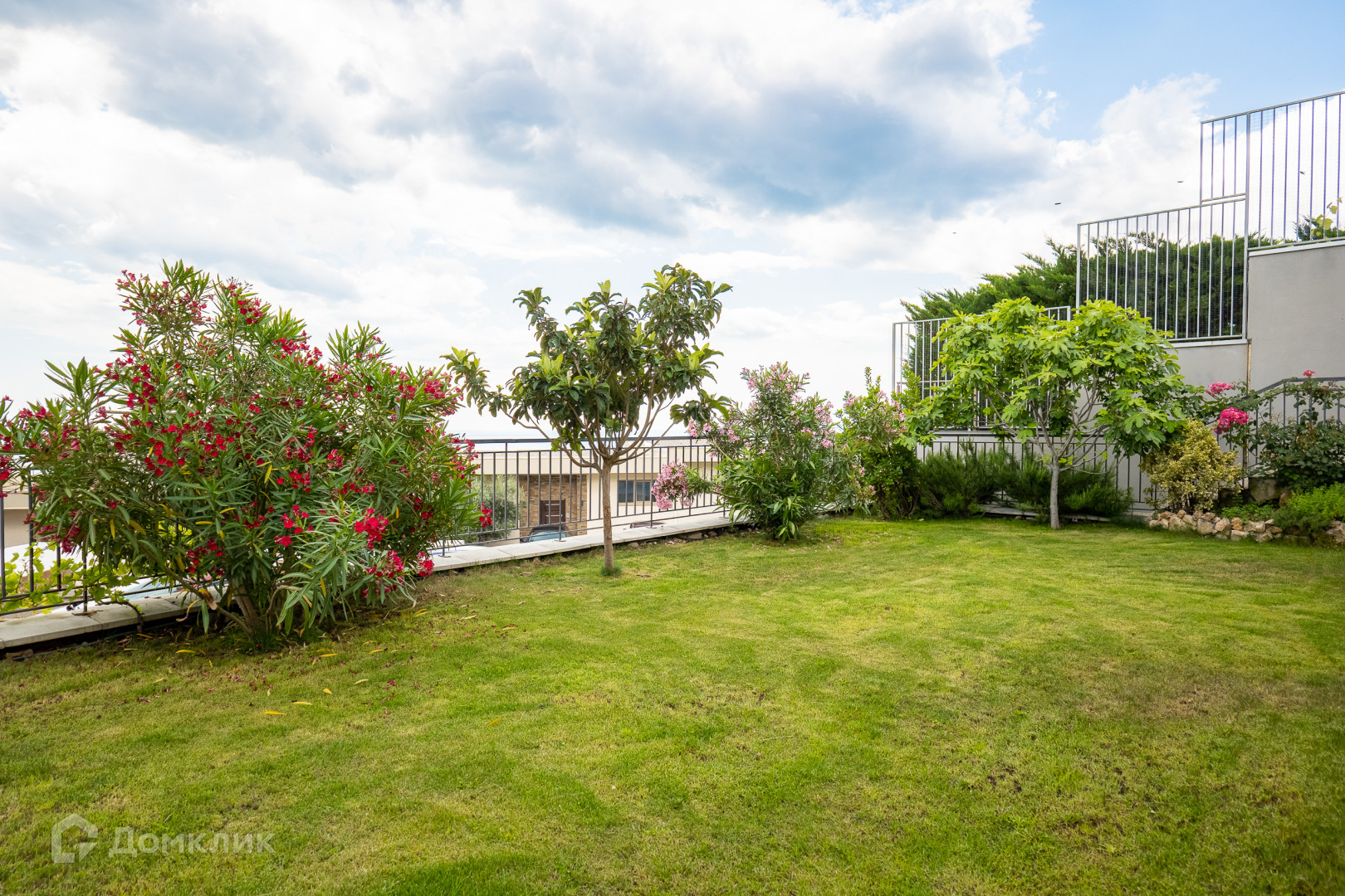 На благоустроенном участке высажены экзотические вечнозеленые растения и плодовые деревья.