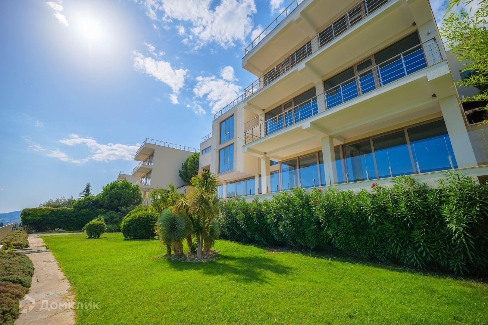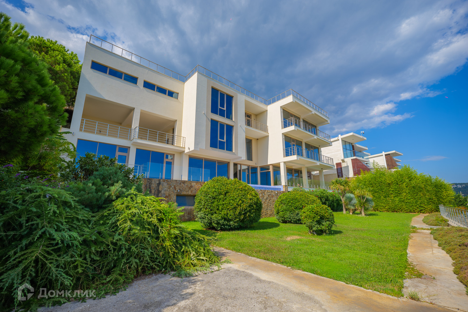 Все этажи и помещения имеют фасадное остекление, алюминиевые раздвижные системы, мультифункциональные стеклопакеты, все форточки с электроприводом. На благоустроенном участке высажены экзотические вечнозеленые растения.