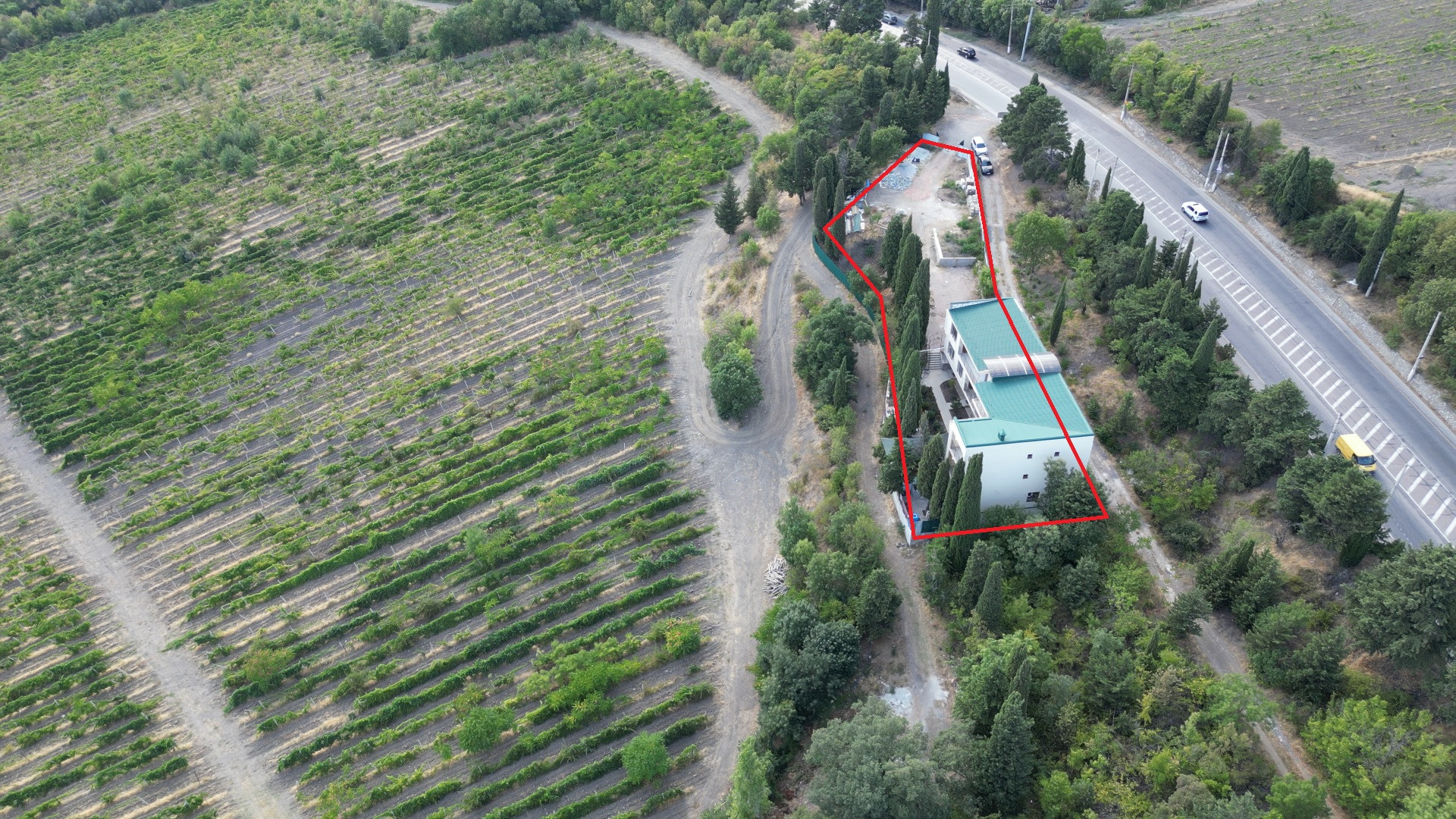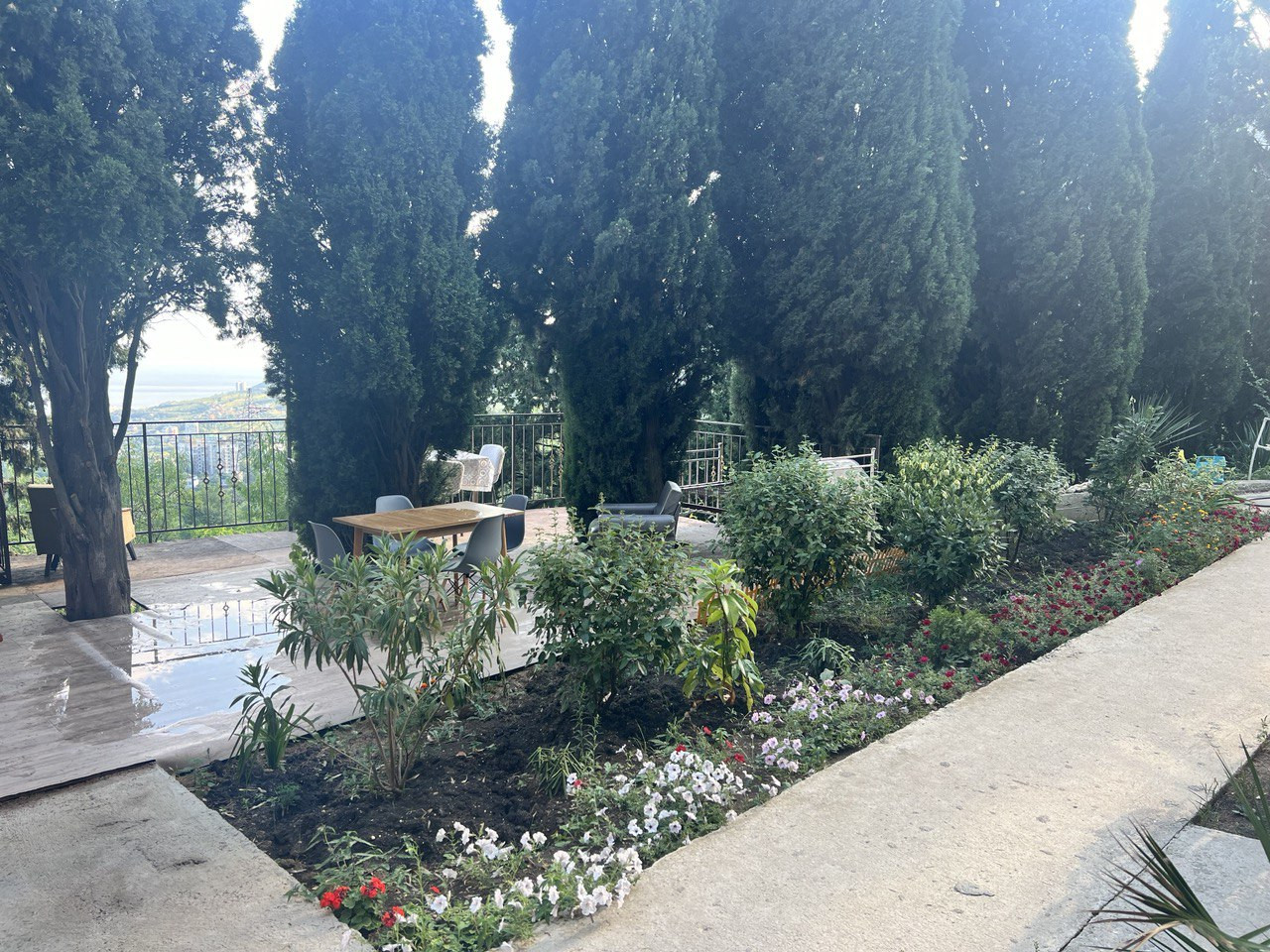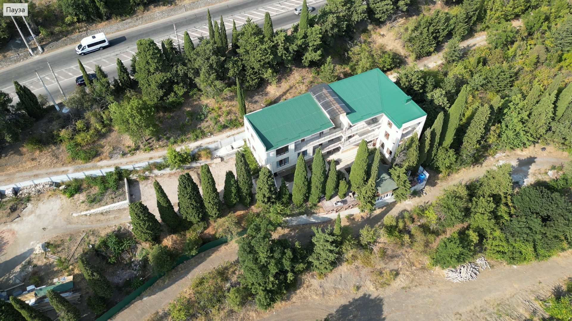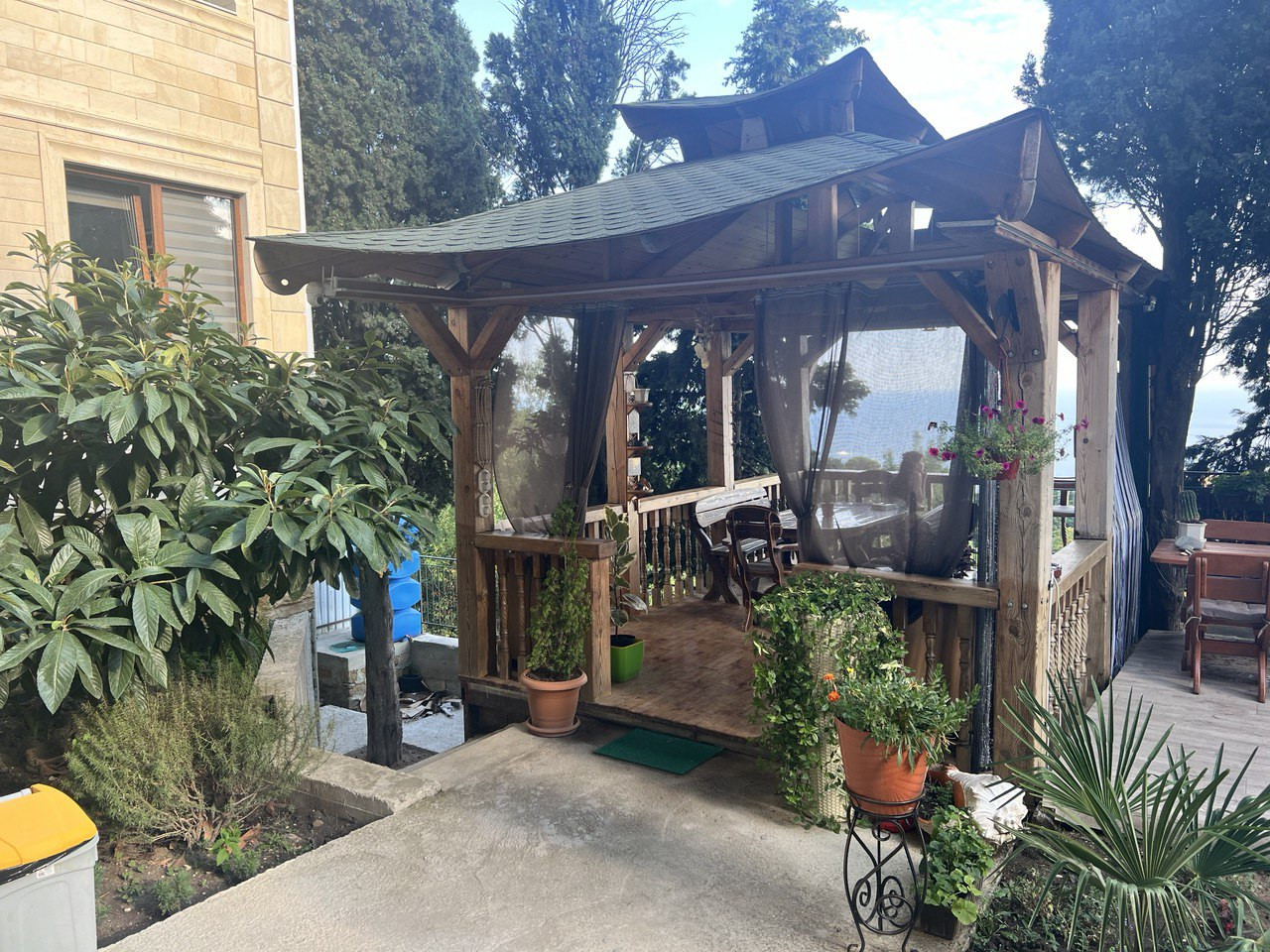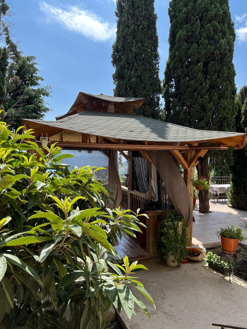 На территории находится видовая беседка, высажены многолетние хвойные деревья и открытая парковка для автомобилей. Застроено 5 соток.