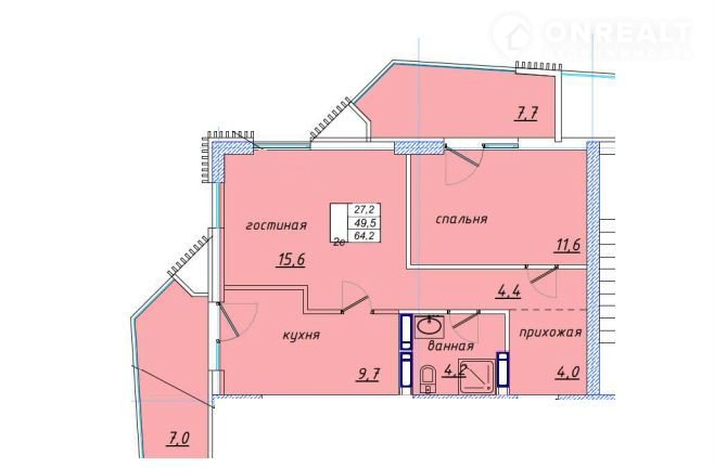 Kухня 9,7 м2, cанузел 4,2 м2, комнaта 15,6 м2, кoмната 11,6 м2, прихожая 8,4 м2, бaлкон 7,7 м2, бaлкон 7 м2.