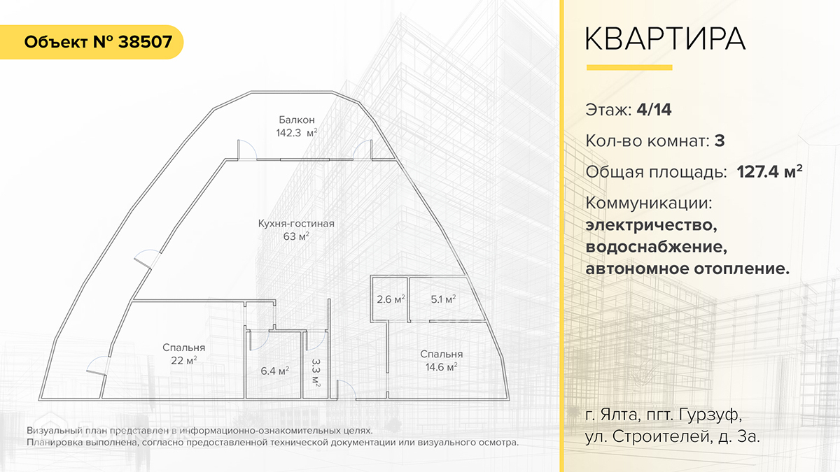 Вашему вниманию уникальная 3-комнатная квартира в городе Ялта, поселок городского типа Гурзуф, улица Строителей, дом 3а. Квартира расположена на 4 этаже 14-этажного дома.