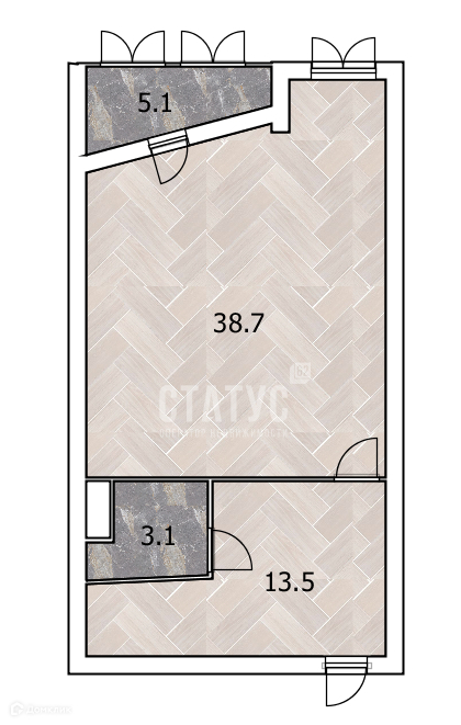 Планировка: кухня-студия – 13.5м², Комната-студия - 38,7м², совмещенный с/у - 3.1м², лоджия – 5,1м².