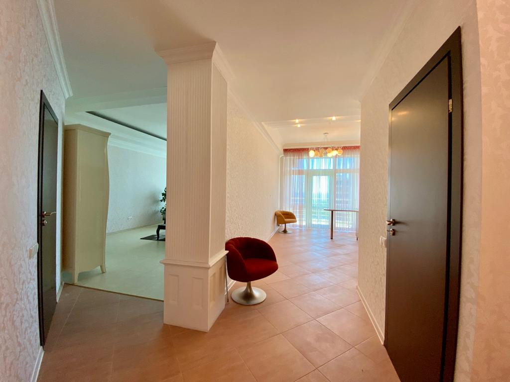 Планировка квартиры включает в себя просторную кухню, две большие комнаты, отличную входную группу, два санузла и две лоджии с шикарным видом на море и территорию комплекса