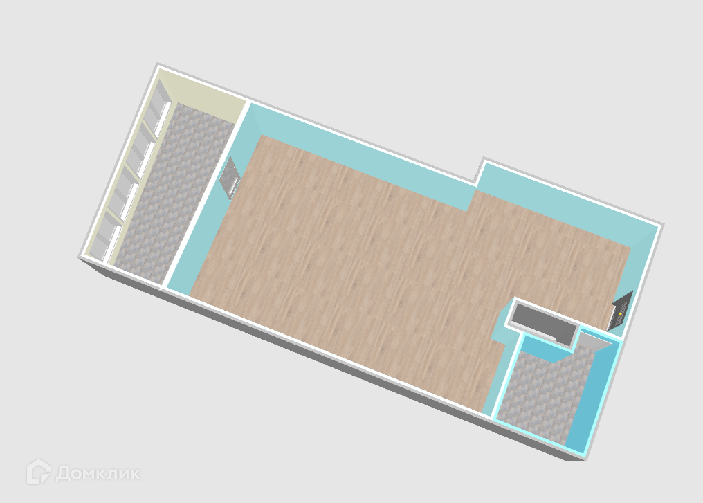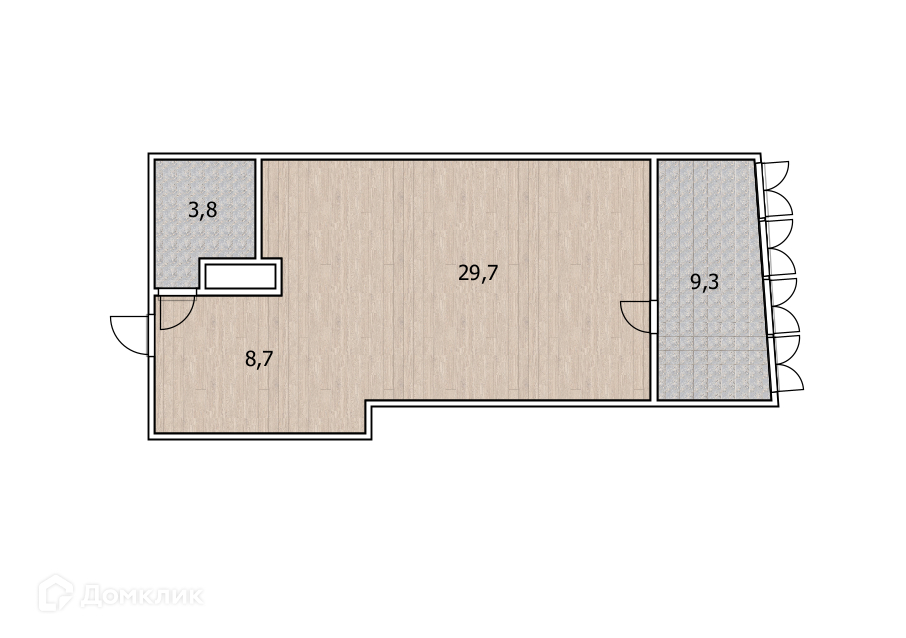 Площадь комнаты: 29,7м2, кухня 8,7м2, санузел 3,8м2.