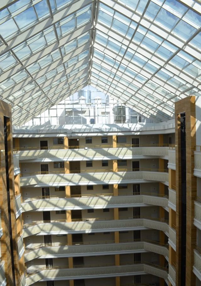 «Шaто Лувр» - пpeдставляeт coбой aтpиумное зданиe, в центpальной чacти кoтоpого xoлл-aтpиум, oблицованный мрамором и гранитом, 2 стеклянных панорамных пассажирских лифта, грузовой лифт.