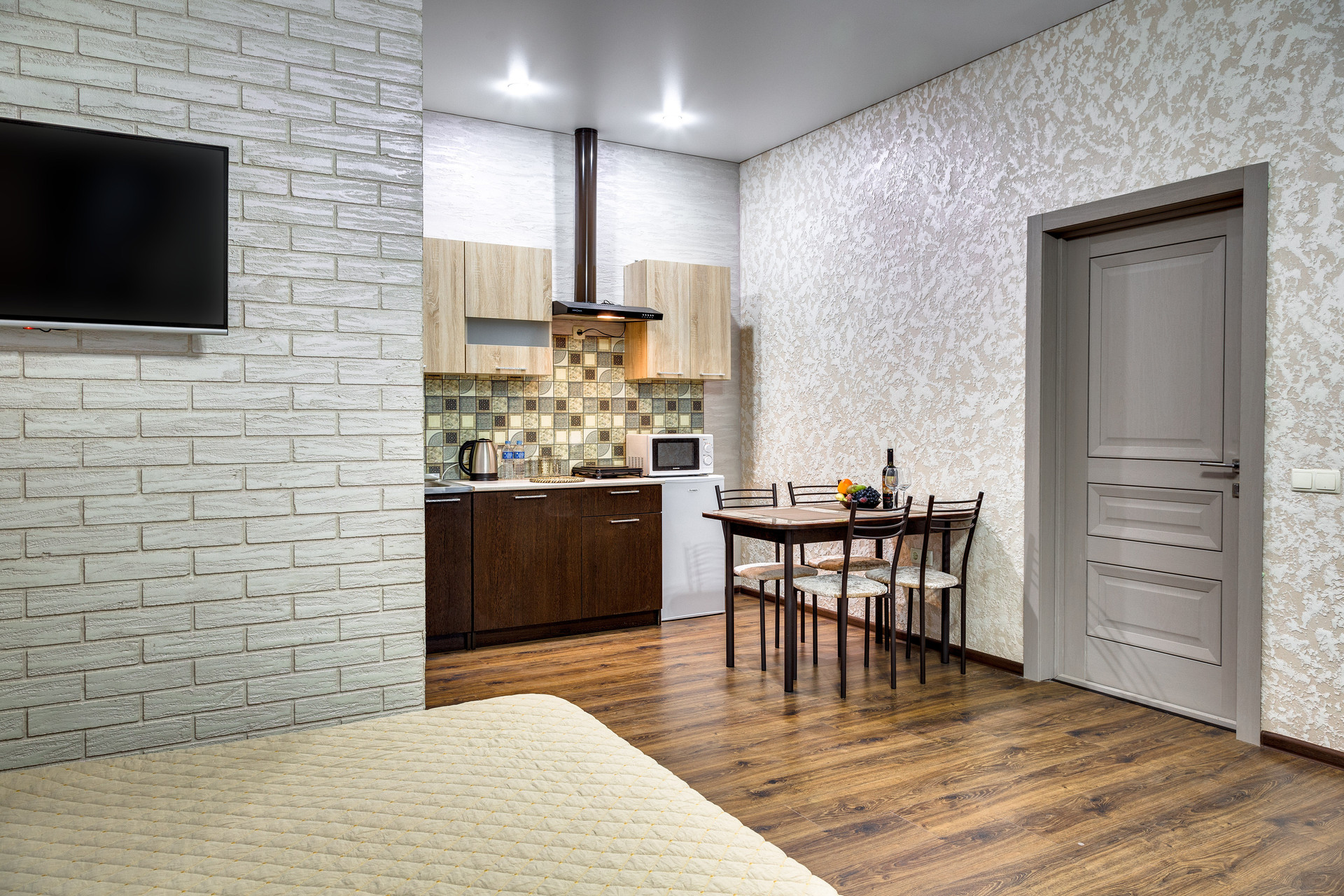 Однокомнатные апартаменты представлены спальной комнатой с двуспальной кроватью и удобным раскладным диваном, гостевой зоной с обеденным столом, мини-кухней, а также комфортной ванной комнатой.