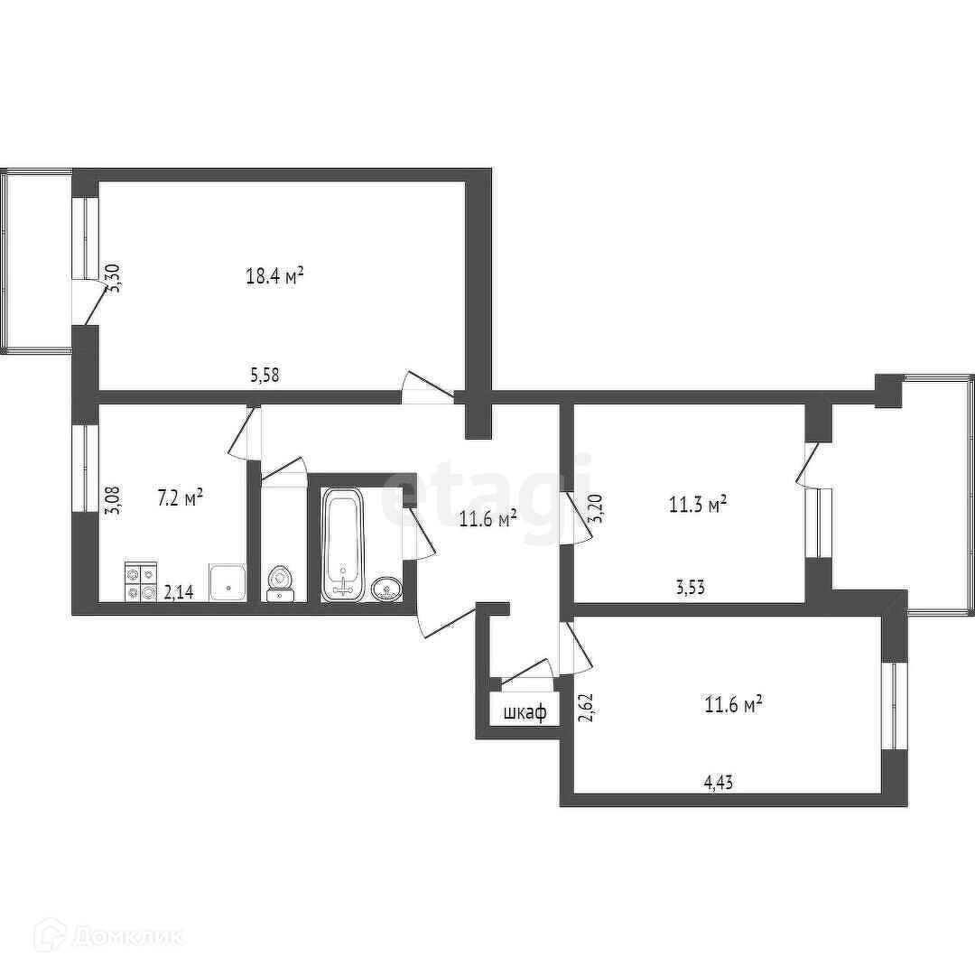 Общая площадь 65 кв. м., жилая 41,3 кв. м., кухня 7,2 кв. м., санузел раздельный.