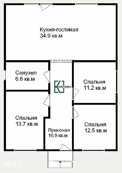 спальни, просторная кухня-гостиная с выходом на участок, санузел, прихожая.