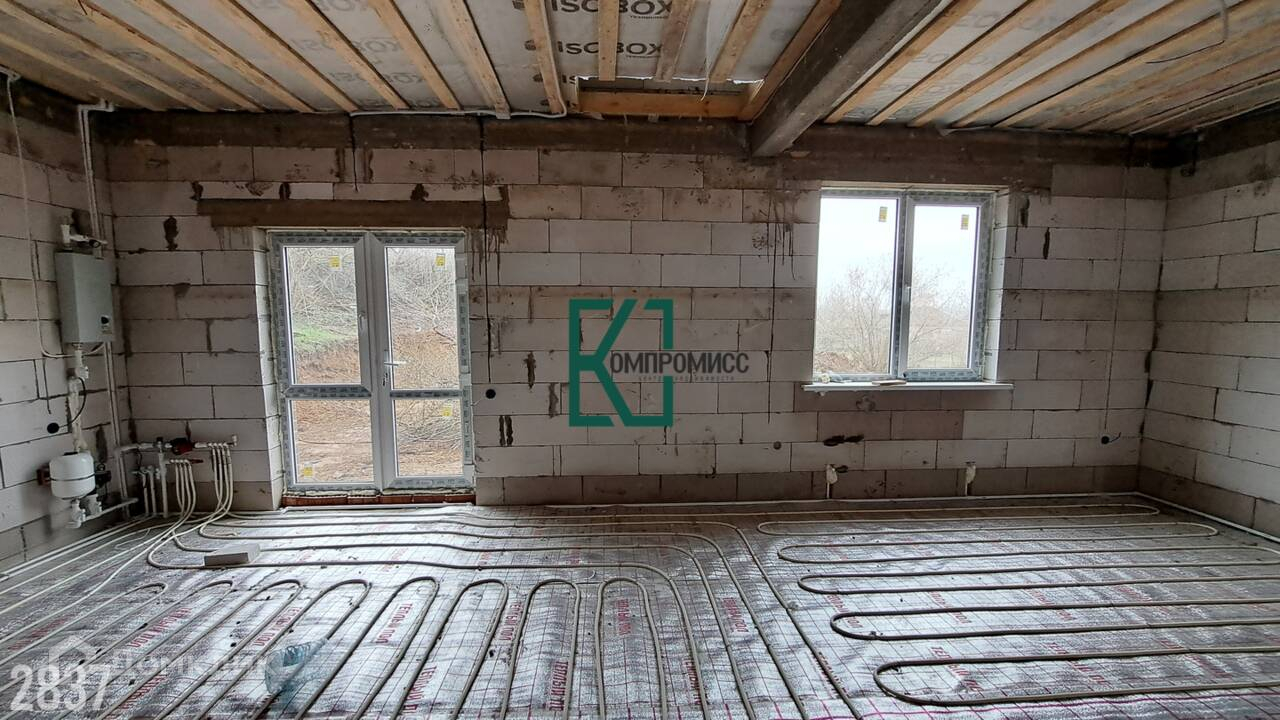 электрический котел, разводка пола по всей площади дома, кроме спален, система