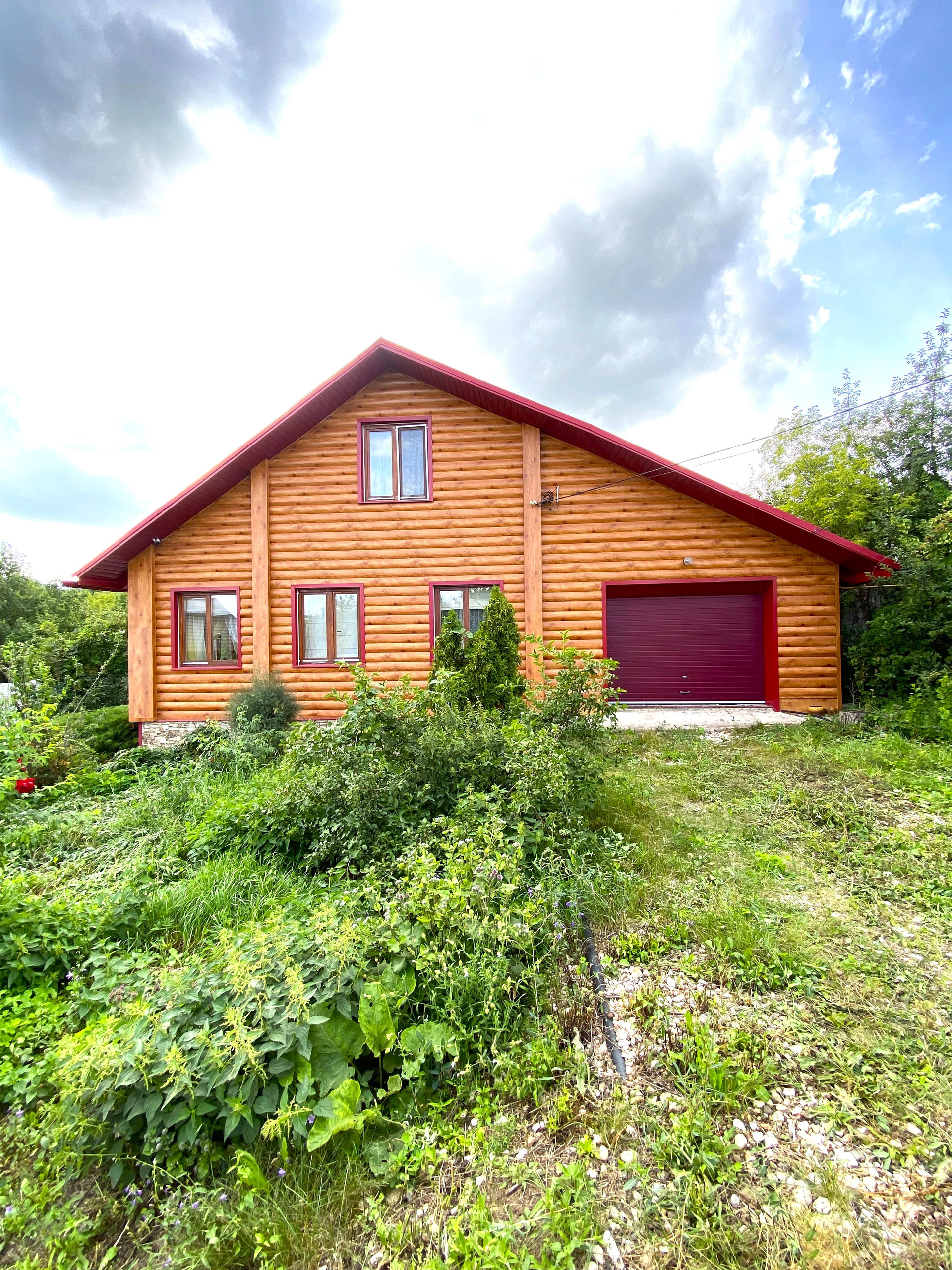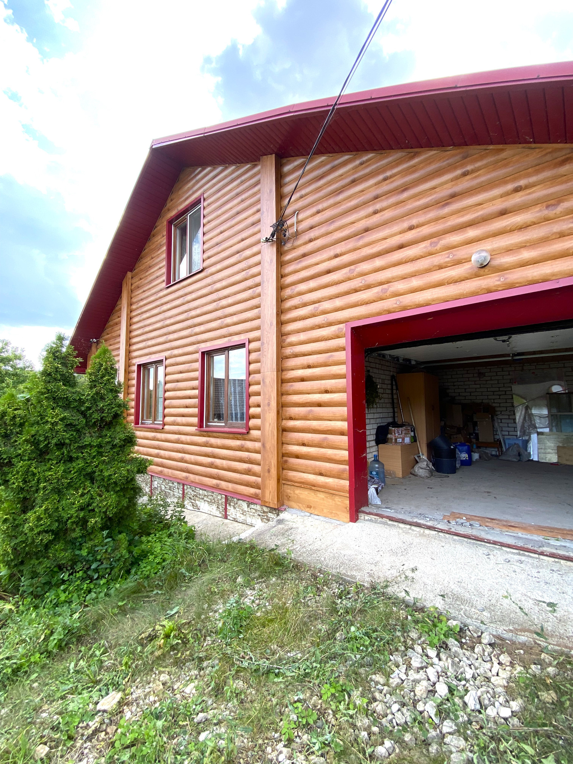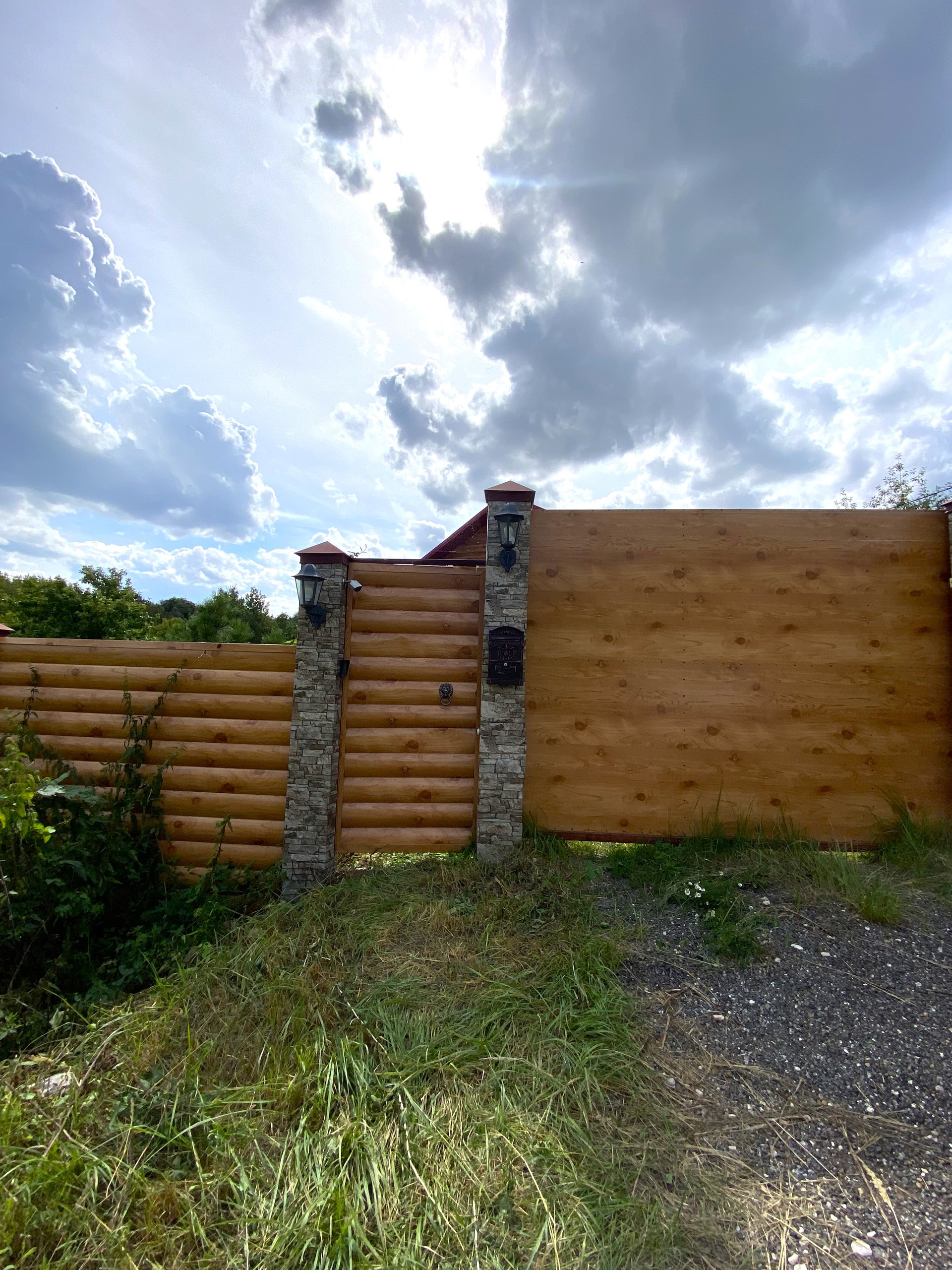 Фасадная часть забора и ворота сделаны из металлосайдинга под бревно (таким же обшит весь коттедж).