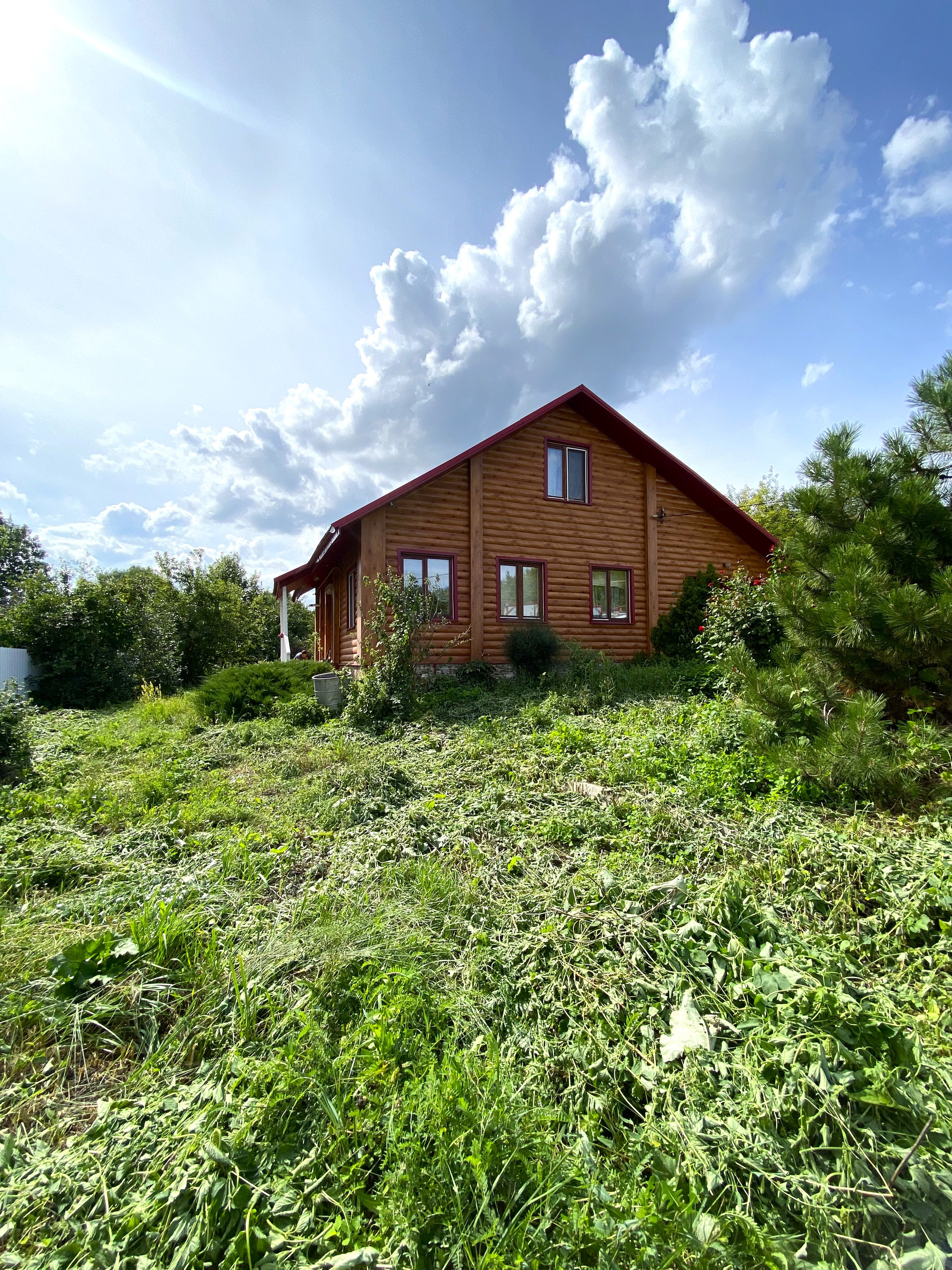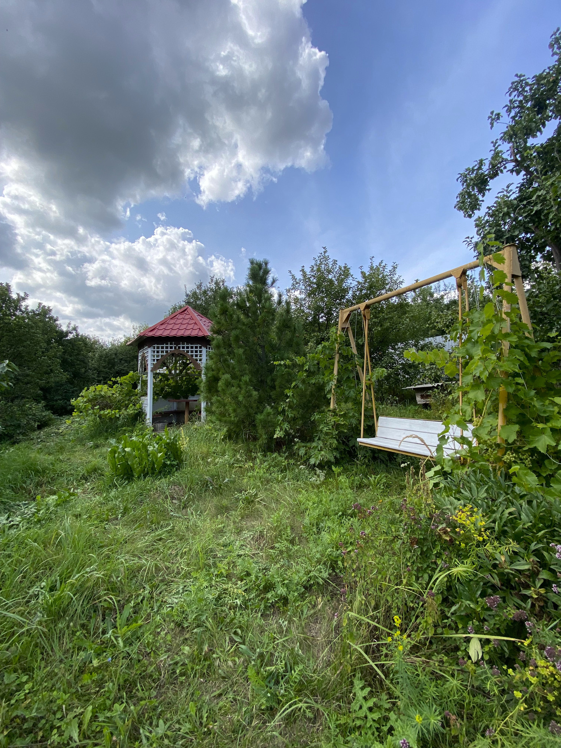 На территории участка: теплица из поликарбоната, беседка, качели, хозблок, турник и шведская лестница, и даже вольер с будкой из бруса.