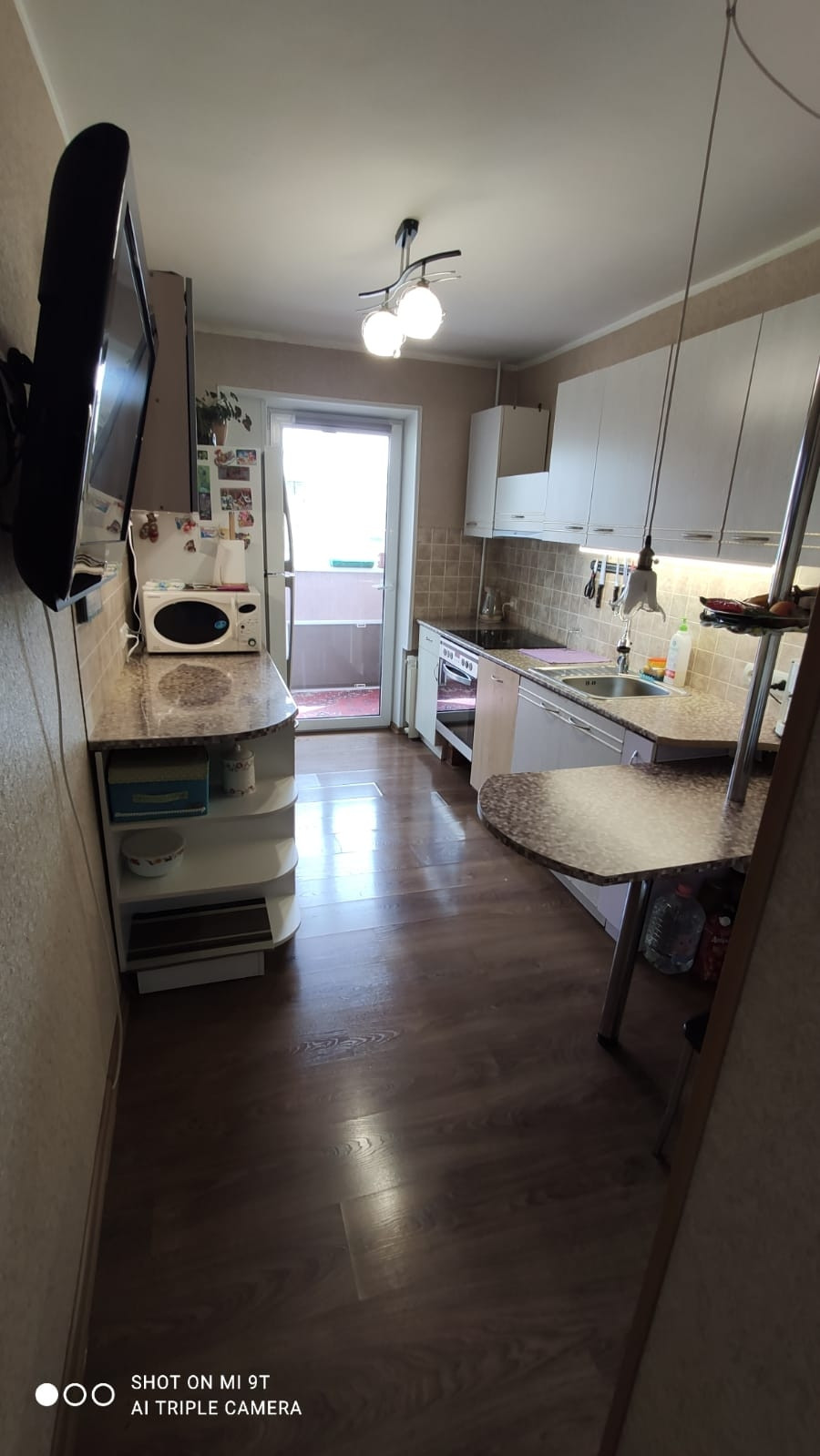 Гостиная и кухня на юг, с дверьми на общую, остекленную лоджию.